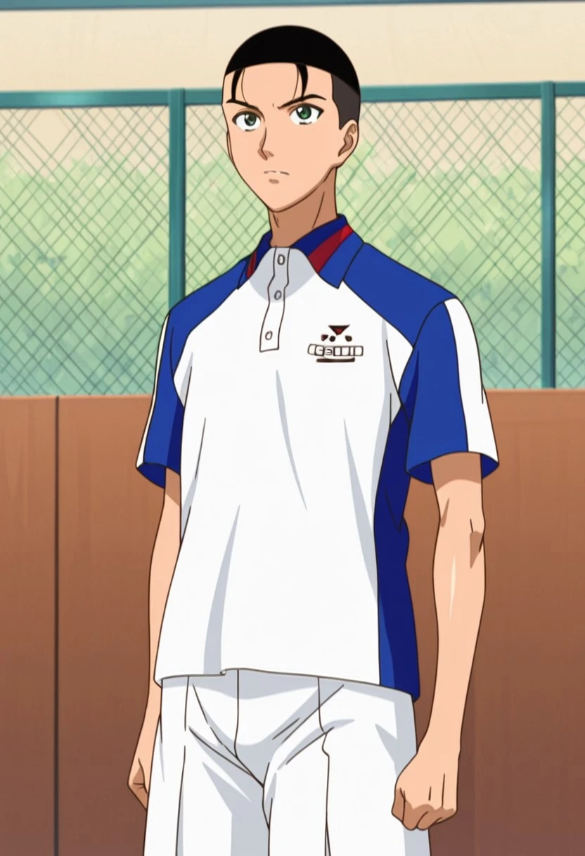 1boy, male focus, solo, green eyes, black hair, buzz cut, tennis uniform, polo shirt, white and blue shirt, short sleeves, raglan sleeves, white shorts, white socks, sneakers,