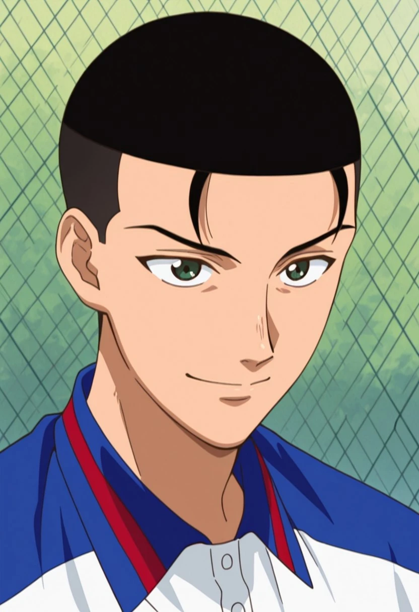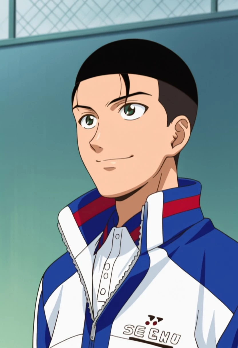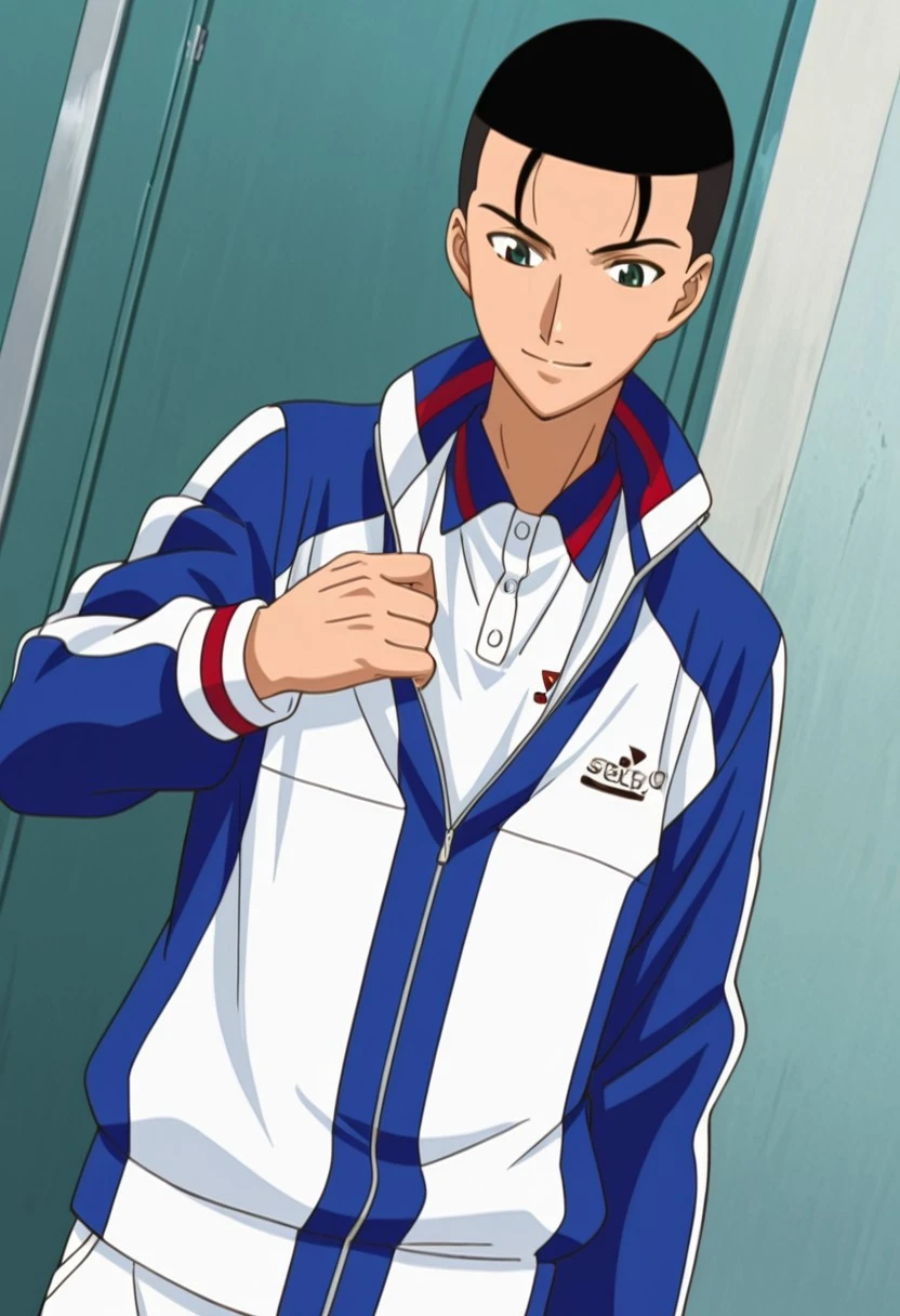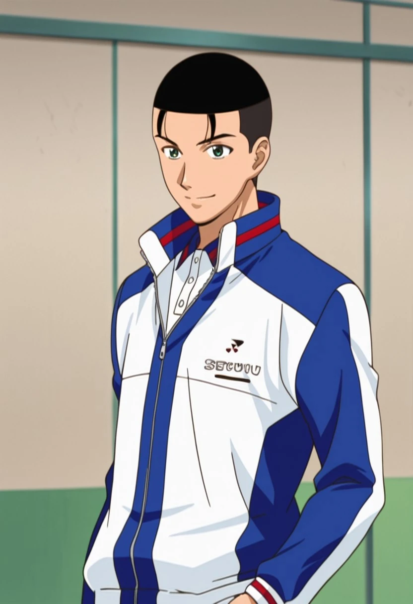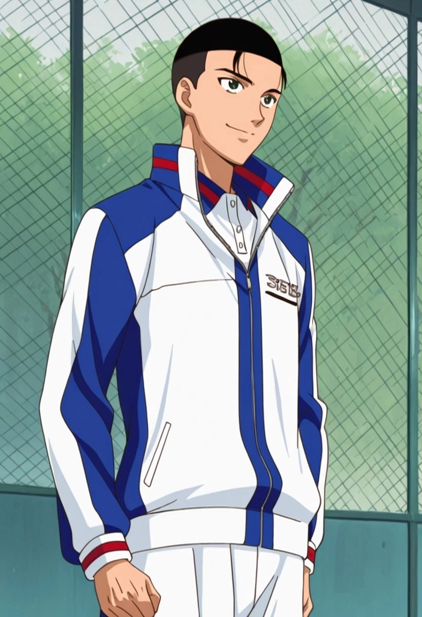 1boy, male focus, solo, green eyes, black hair, buzz cut, tennis uniform, jacket, track jacket, white and blue jacket, partially unzipped, polo shirt, blue pants, sneakers,