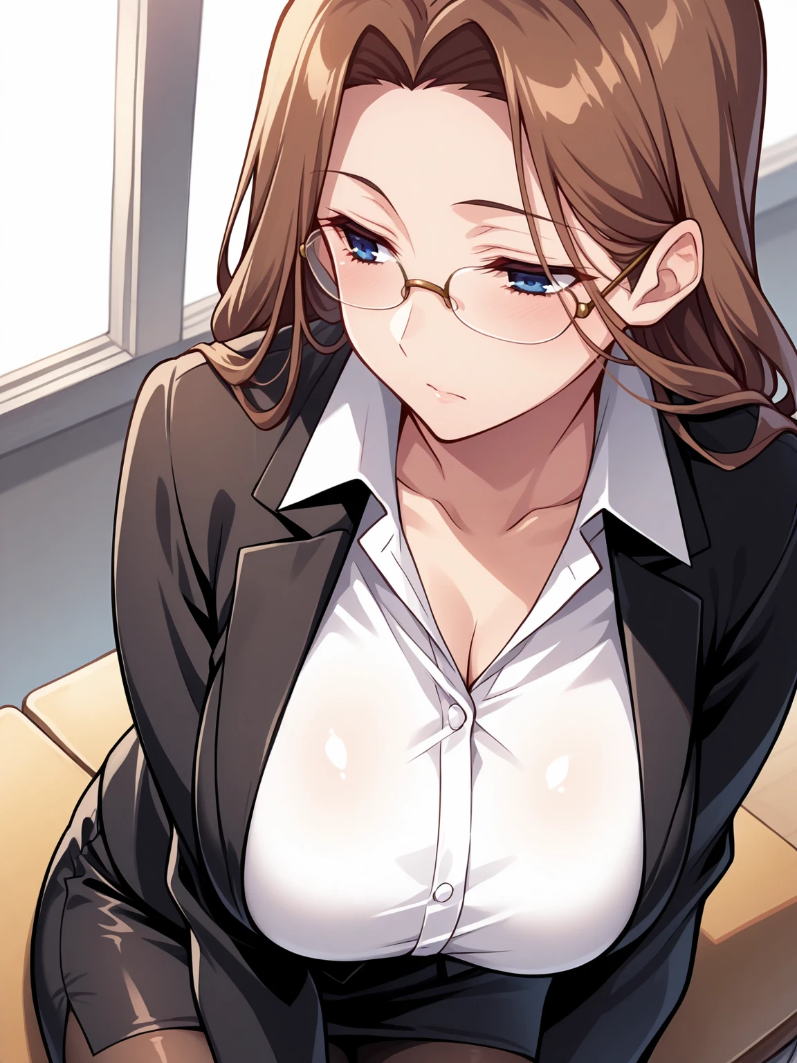 eleber, brown hair, blue eyes, large breasts, mature female