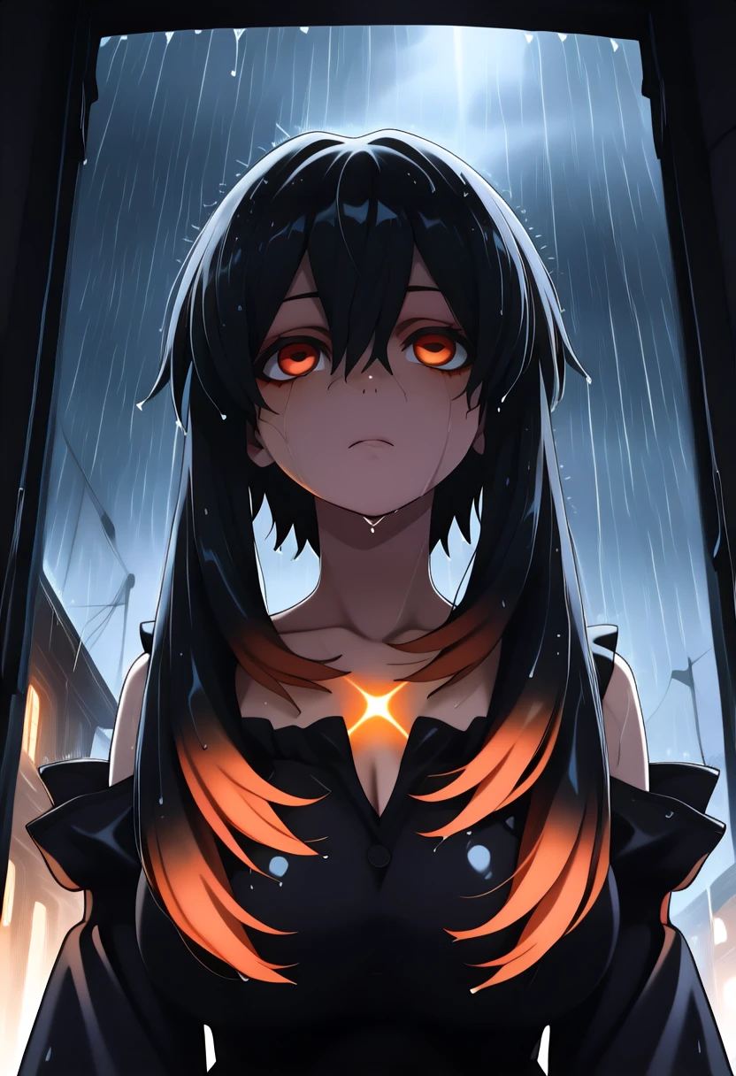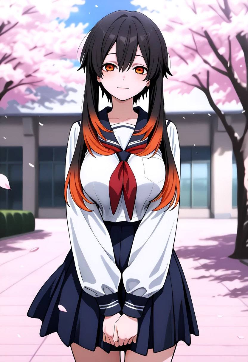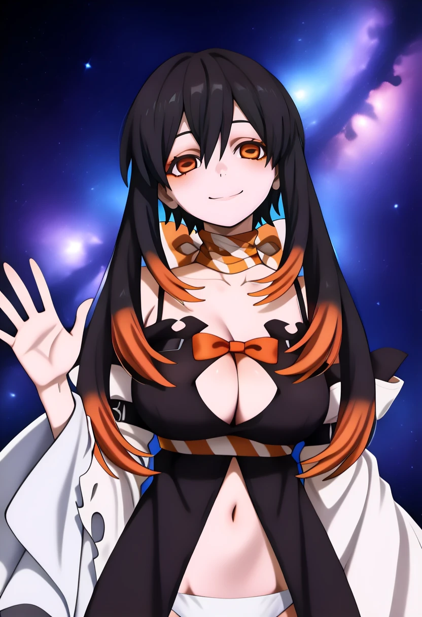 1girl, solo, very long hair, hair between eyes, short hair with long locks, multicolored hair, black hair, orange hair, orange eyes, colored tips, horizontal pupils, large breasts