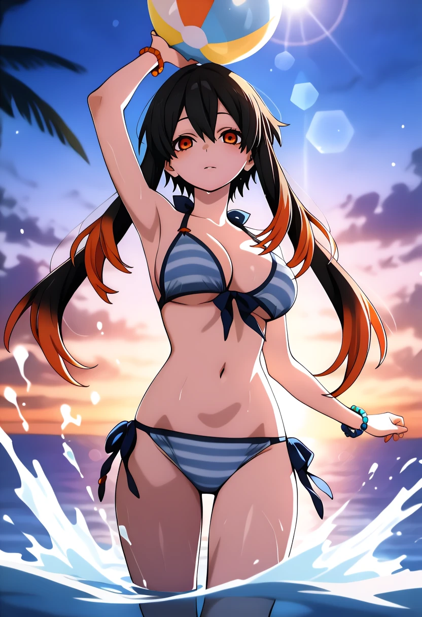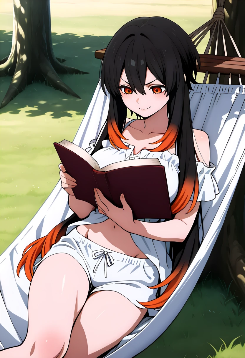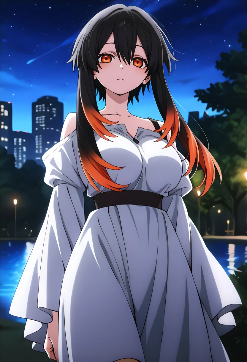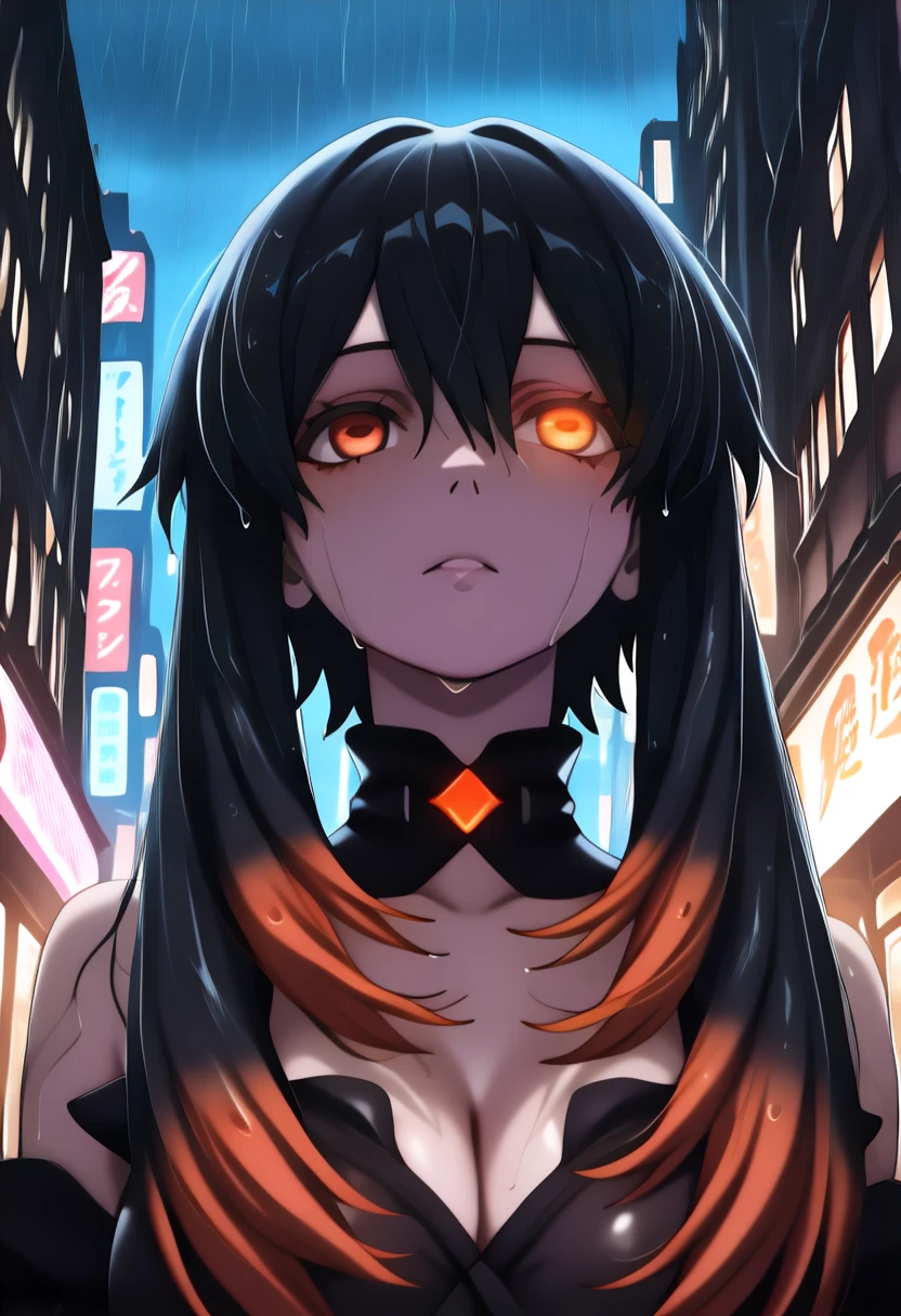 1girl, solo, very long hair, hair between eyes, short hair with long locks, multicolored hair, black hair, orange hair, orange eyes, colored tips, horizontal pupils, large breasts