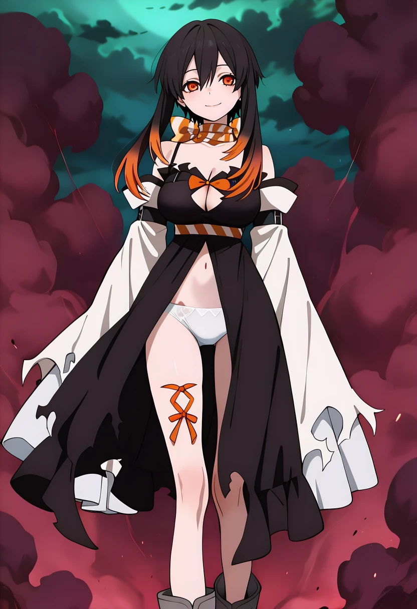 collarbone, cleavage, cleavage cutout, striped scarf, orange scarf, white scarf, black dress, spaghetti strap, bare shoulders, , torn dress, chest bow, orange bow, striped sash, skinny, navel, detached sleeves, wide sleeves, white sleeves, torn sleeves, sleeves past fingers, arm belt, white panties, leg ribbon, orange ribbon, gray boots