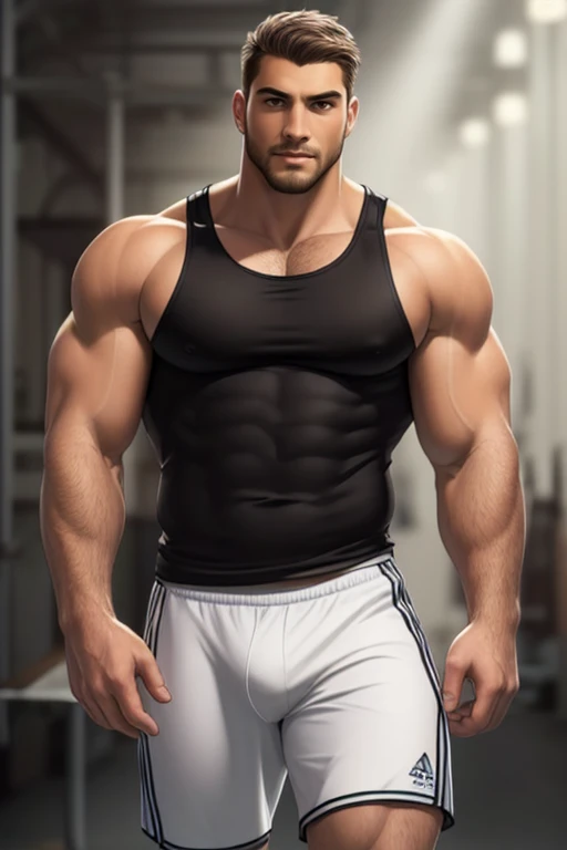 Positive prompt : (1man), muscular, brown eyes, casual clothes, wearing a (white) tight short, big bulge, (intricate details, Masterpiece, high quality, best quality)