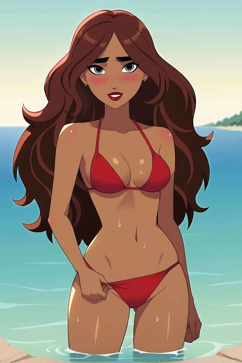 Base Prompt: 1girl, solo, dark skin, dark-skinned female, grey eyes, red hair, long hair, earrings, jewelry, red lips