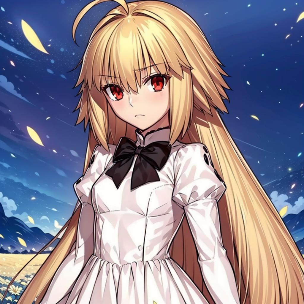 正面:Arcueid Lily, 1girl, solo, blonde hair, red eyes,long hair, very long hair, arcueid brunestud, puffy sleeves, long sleeves, bowtie, bangs, dress, white dress, ahoge, juliet sleeves, black bowtie, sidelocks, hair between eyes, aged down, <lora:0.8>,