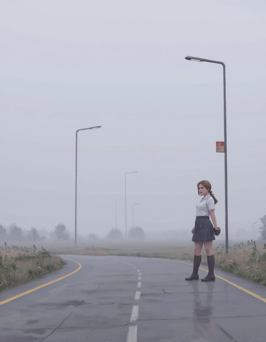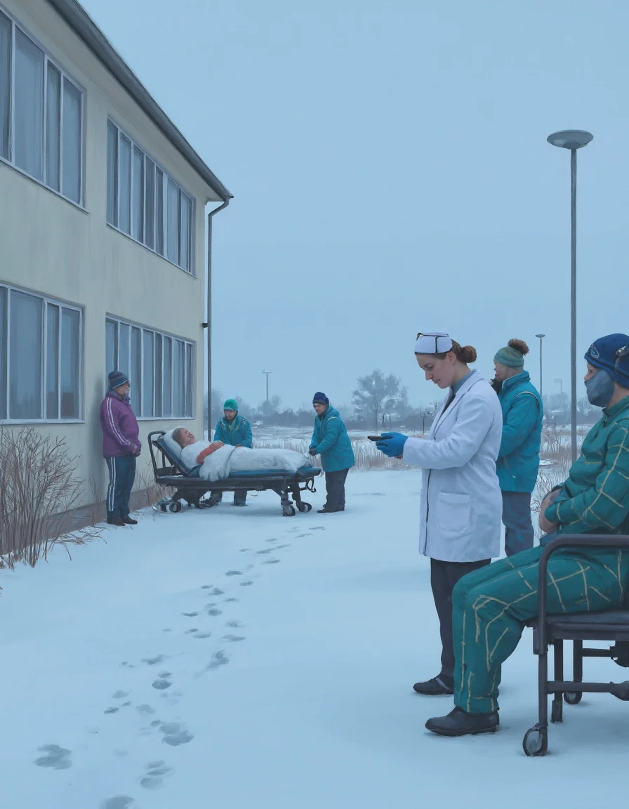 a digital painting of a woman standing in the snow with a grocery bag in the style of simon-stalenhag
