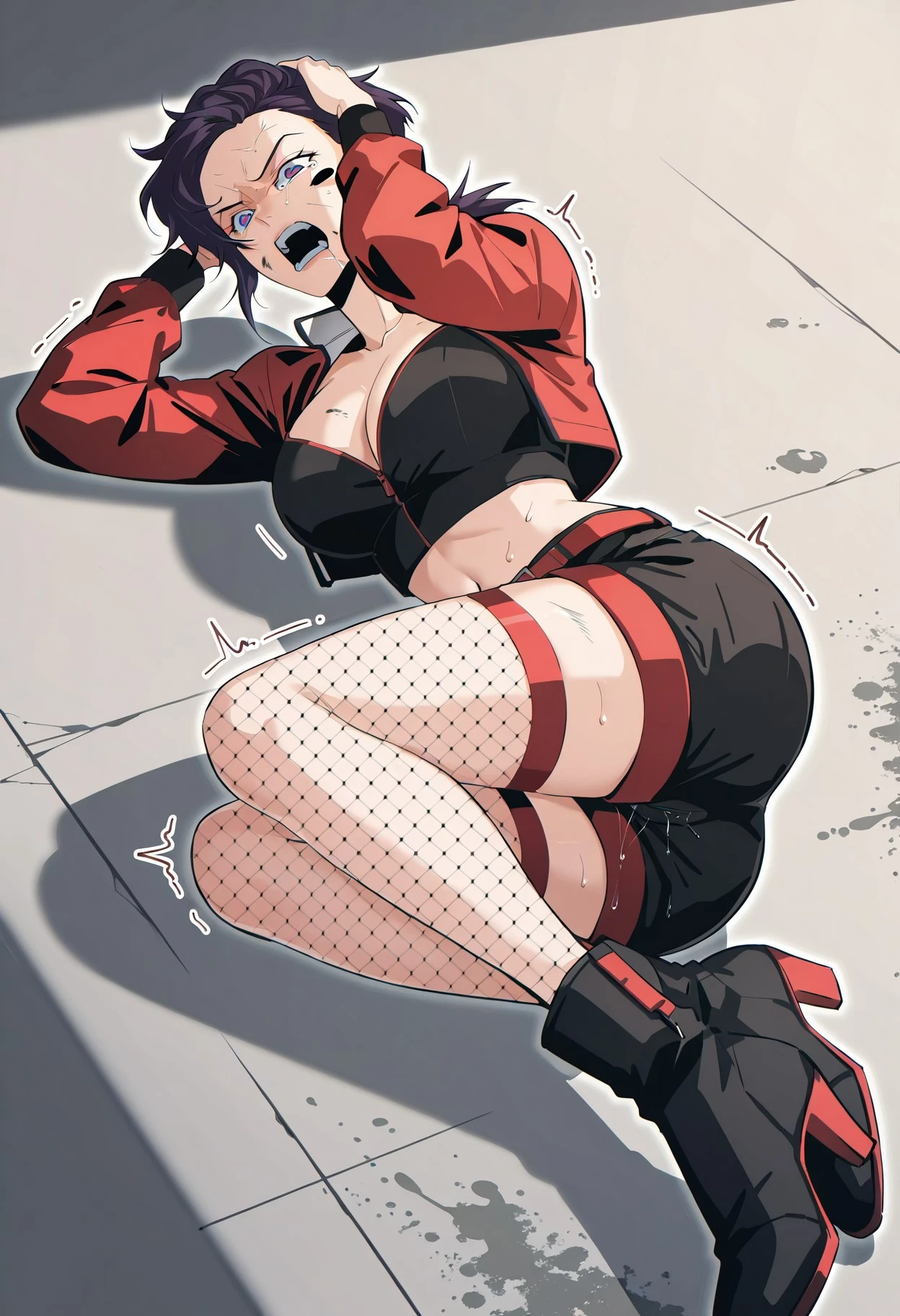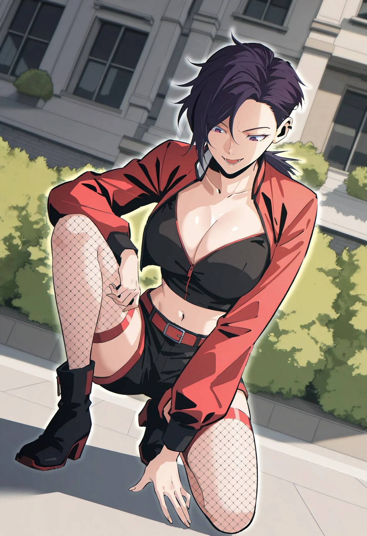 Default_outfit, red cropped jacket with black trim, stand collars, white lining, black cuffs, black top with red zipper, cropped top, fitted top, exposed cleavage, midriff, black shorts, red belt, red leg opening, black fishnet stockings, red trim on stockings, black ankle boots, colorblocked boots,