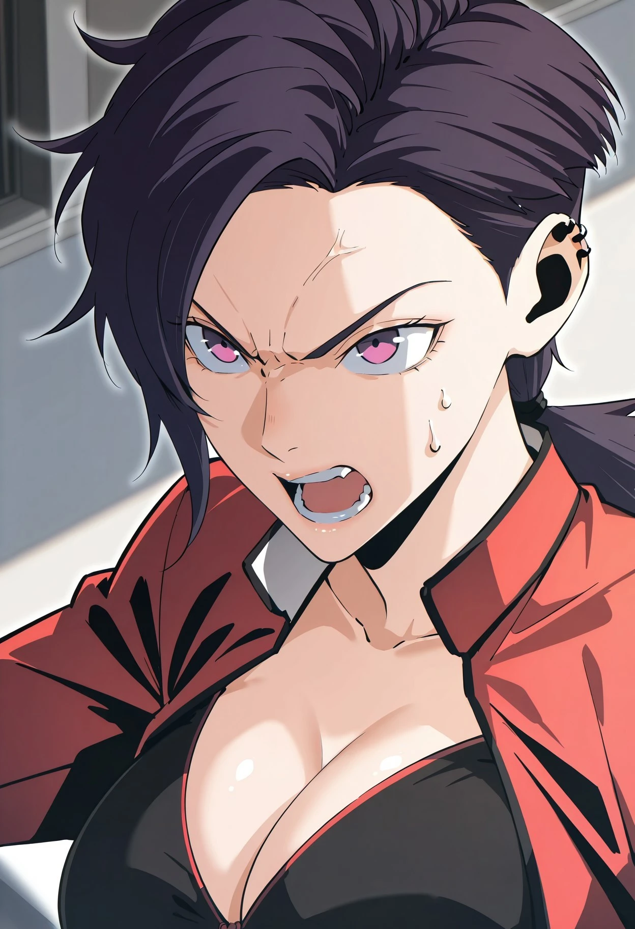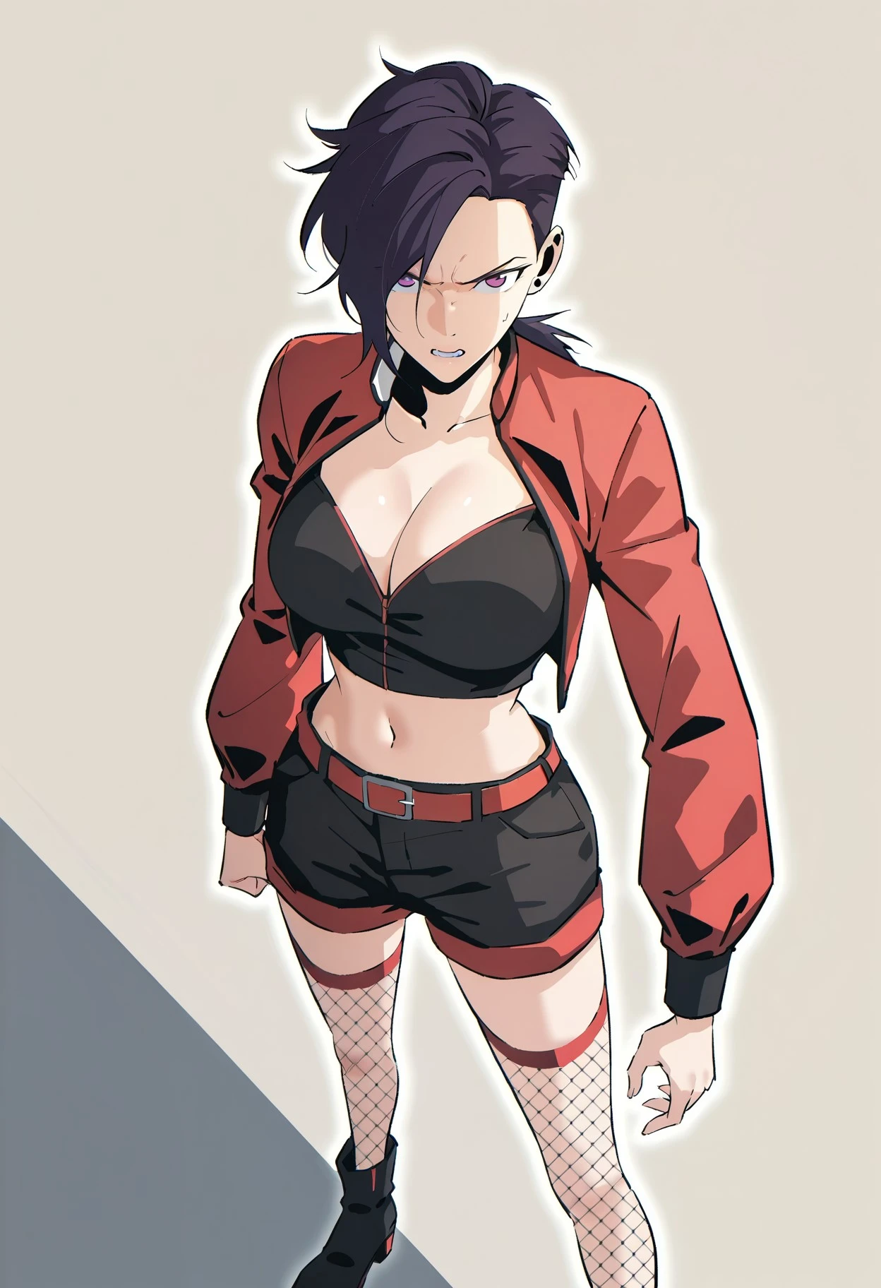 1girl, solo, ljrui, dark purple hair, punk hairstyle, side-swept bangs, short ponytail, rough hair, delicate face, tapered jawline, thin arched eyebrows, light purple eyes, silver cartilage earrings, large breasts, slim body, narrow waists, slim long legs,
