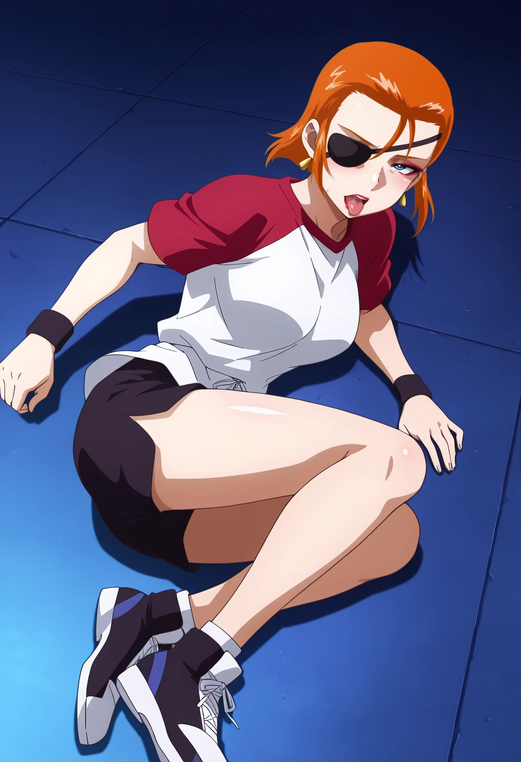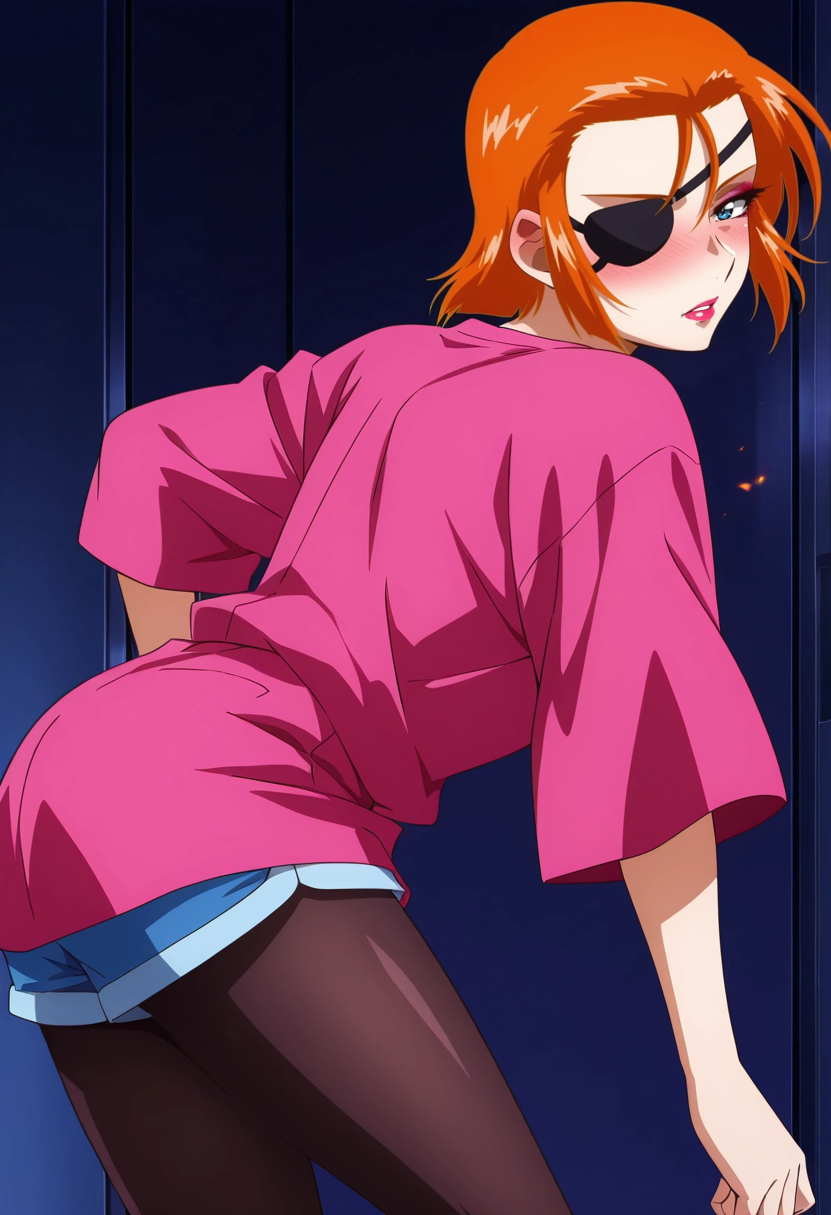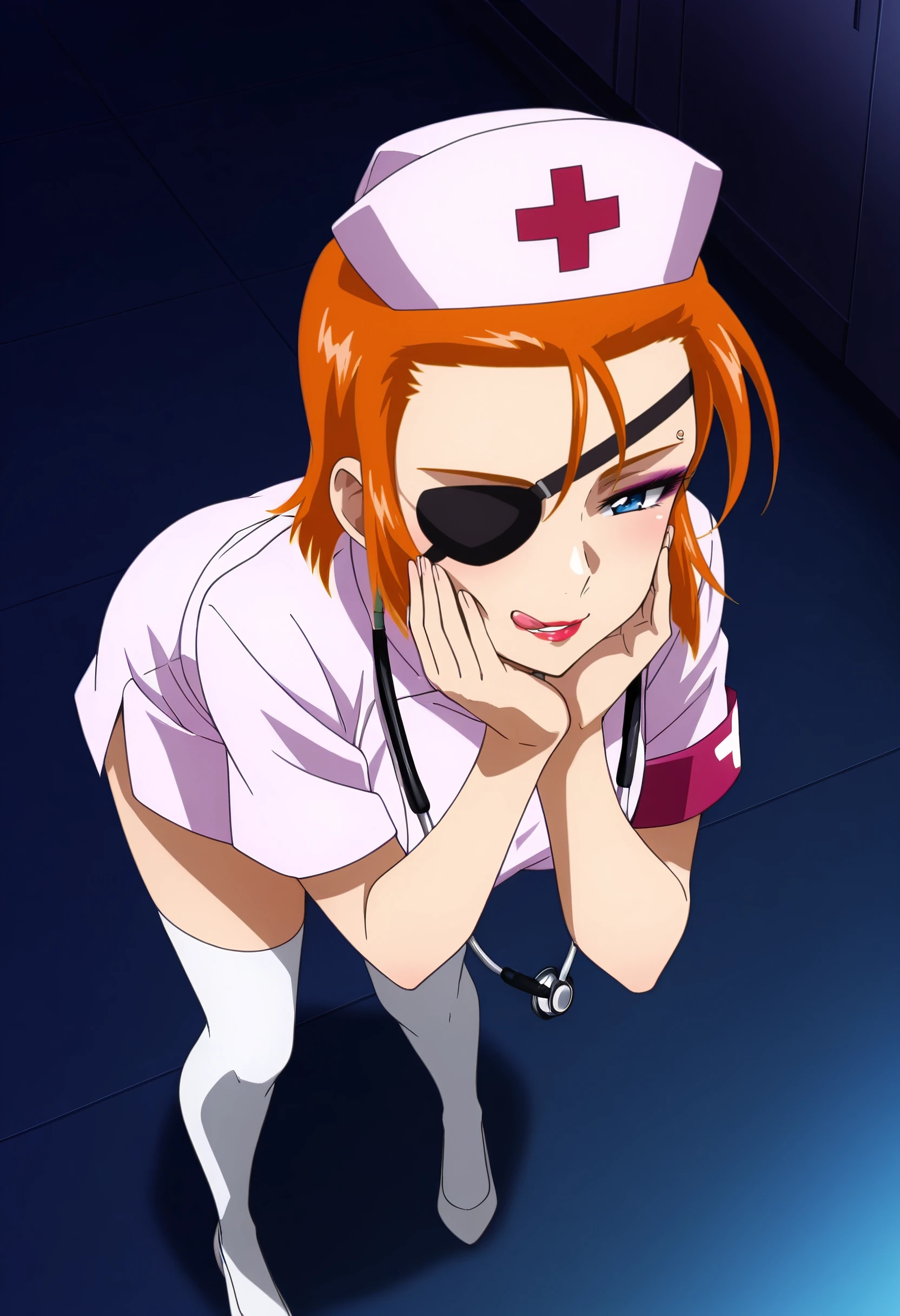 KSGHilda, orange hair, blue eyes, short hair, makeup, lipstick, eyepatch, one eye covered,