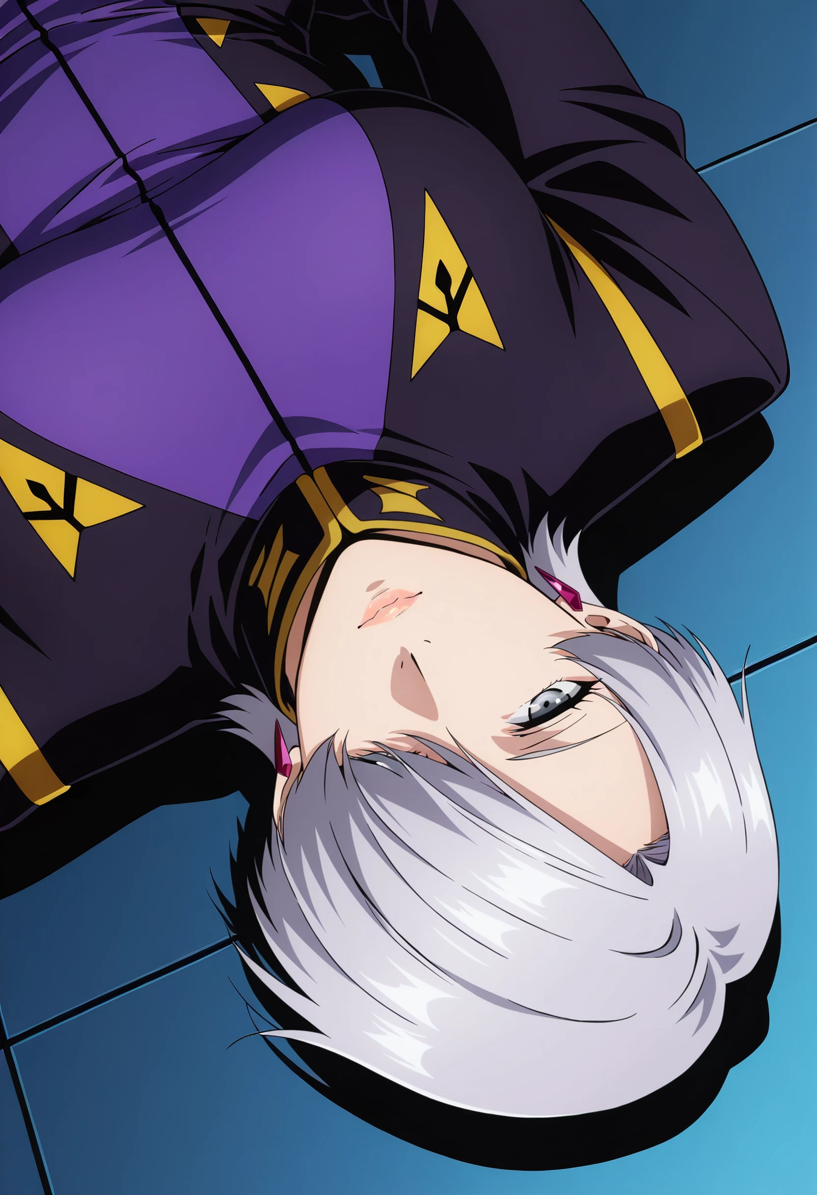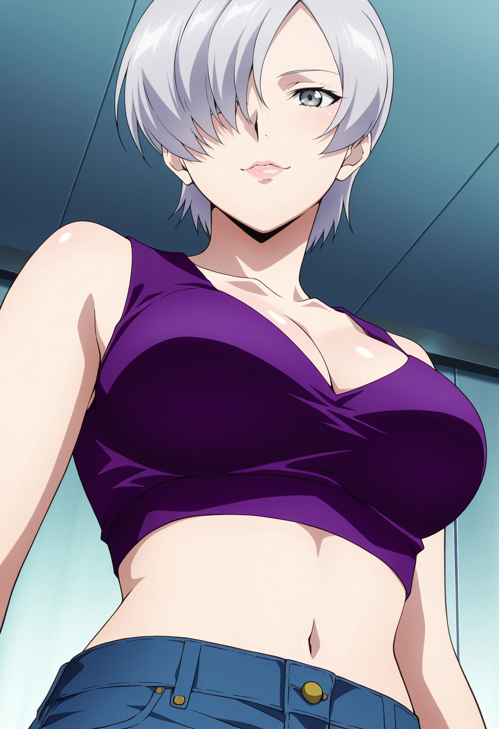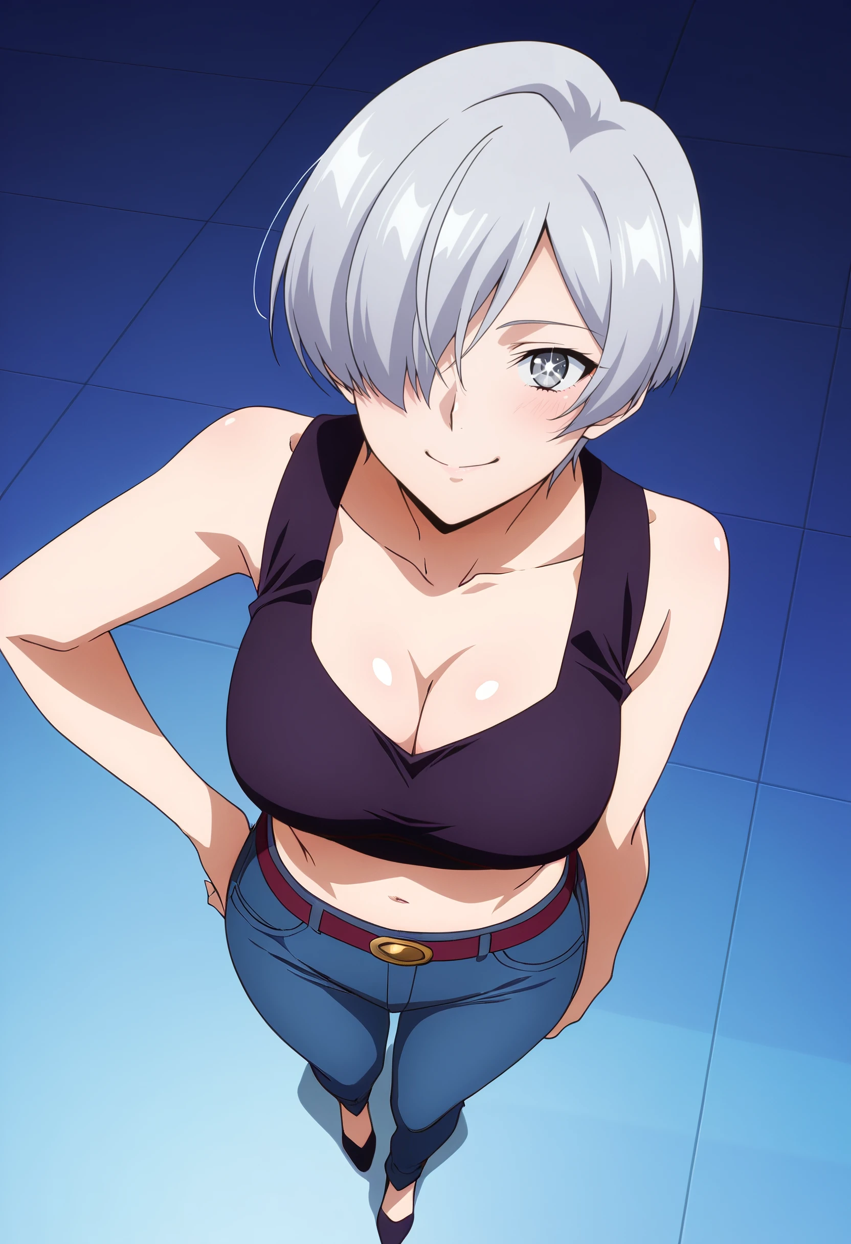 KSGEzalia, short hair, silver hair, hair over one eye, grey eyes, bangs,