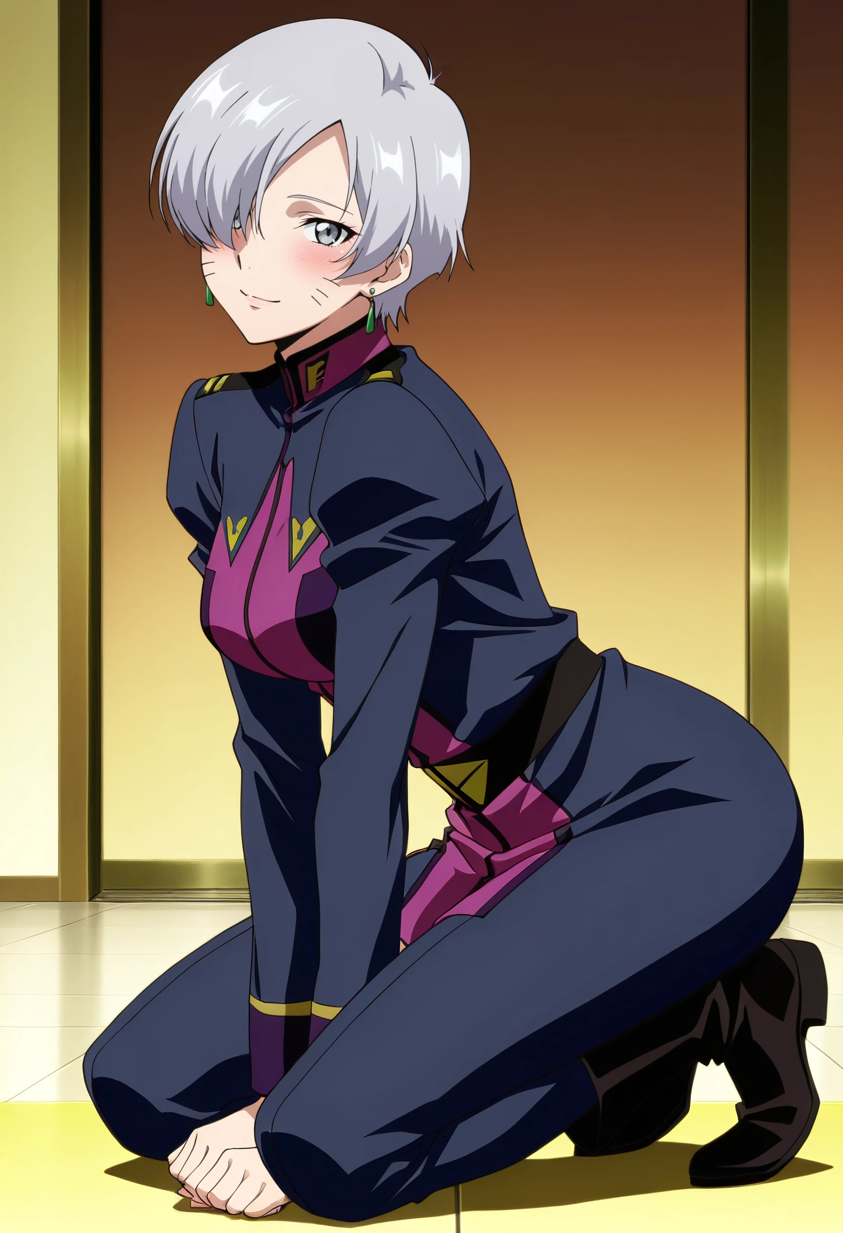 black jacket, jacket, uniform, turtleneck, earrings,