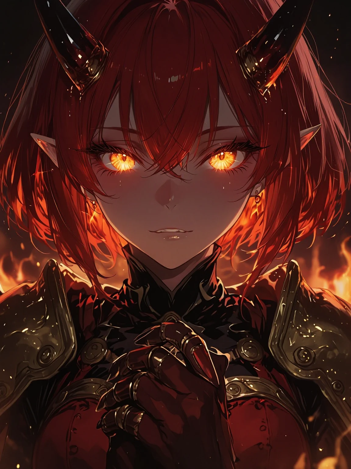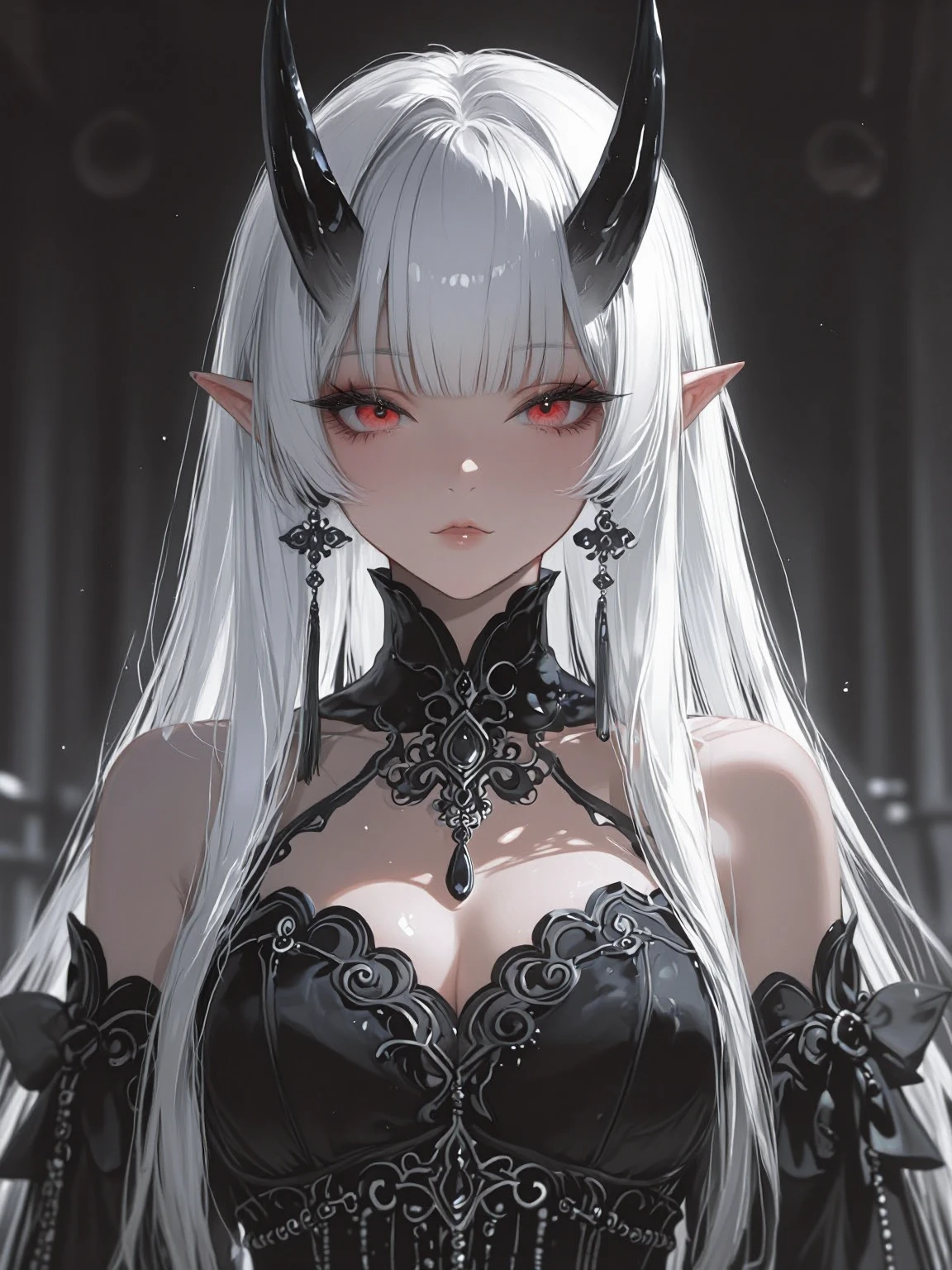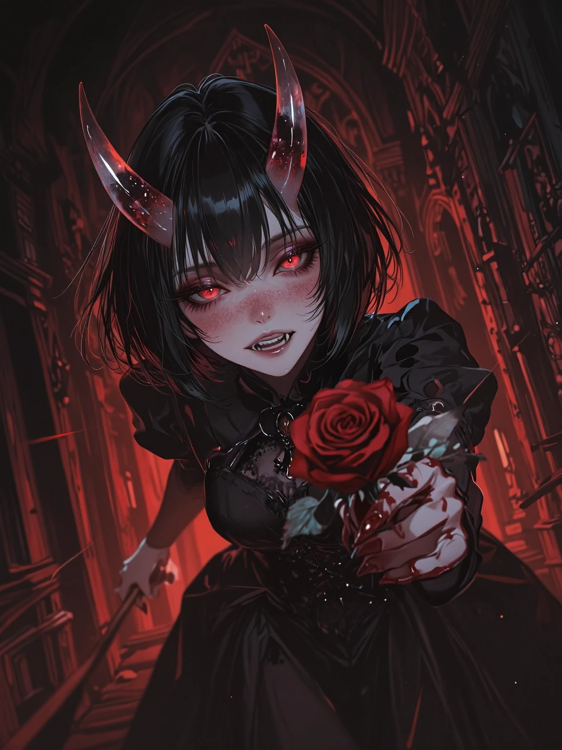 this is a digital anime-style illustration featuring a dark-haired, horned female character with glowing, multicolored eyes, she is surrounded by a lush garden filled with white roses and thorny vines, the character, with a delicate, yet intense expression, holds a thorny branch adorned with red berries and white roses, her black hair is adorned with a white rose and her horns are dark and curved, the background is a bokeh of warm, golden light, creating a magical, ethereal atmosphere, water droplets and sparkles are scattered across the image, adding to the enchanting feel, the overall composition is rich in detail and texture, emphasizing the contrast between the characters dark features and the bright, luminous elements around her