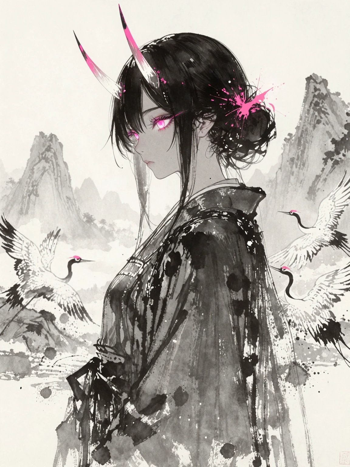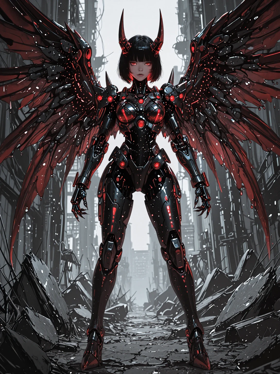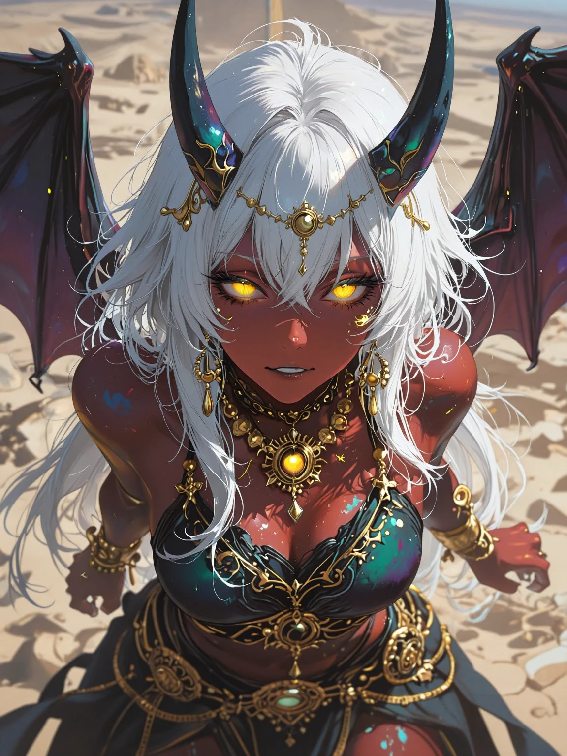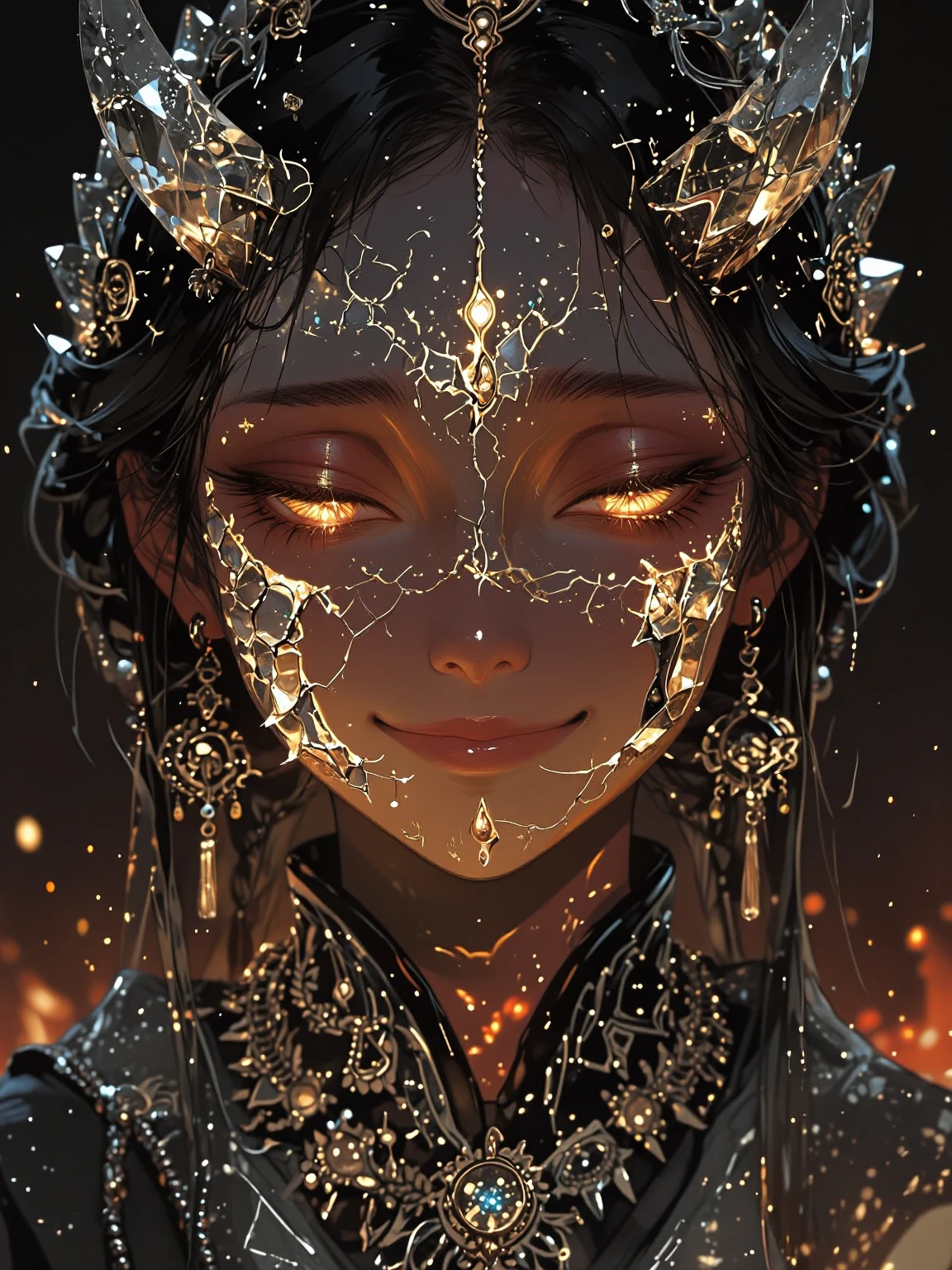 this is a digital anime-style illustration featuring a dark-haired, horned female character with glowing, multicolored eyes, she is surrounded by a lush garden filled with white roses and thorny vines, the character, with a delicate, yet intense expression, holds a thorny branch adorned with red berries and white roses, her black hair is adorned with a white rose and her horns are dark and curved, the background is a bokeh of warm, golden light, creating a magical, ethereal atmosphere, water droplets and sparkles are scattered across the image, adding to the enchanting feel, the overall composition is rich in detail and texture, emphasizing the contrast between the characters dark features and the bright, luminous elements around her