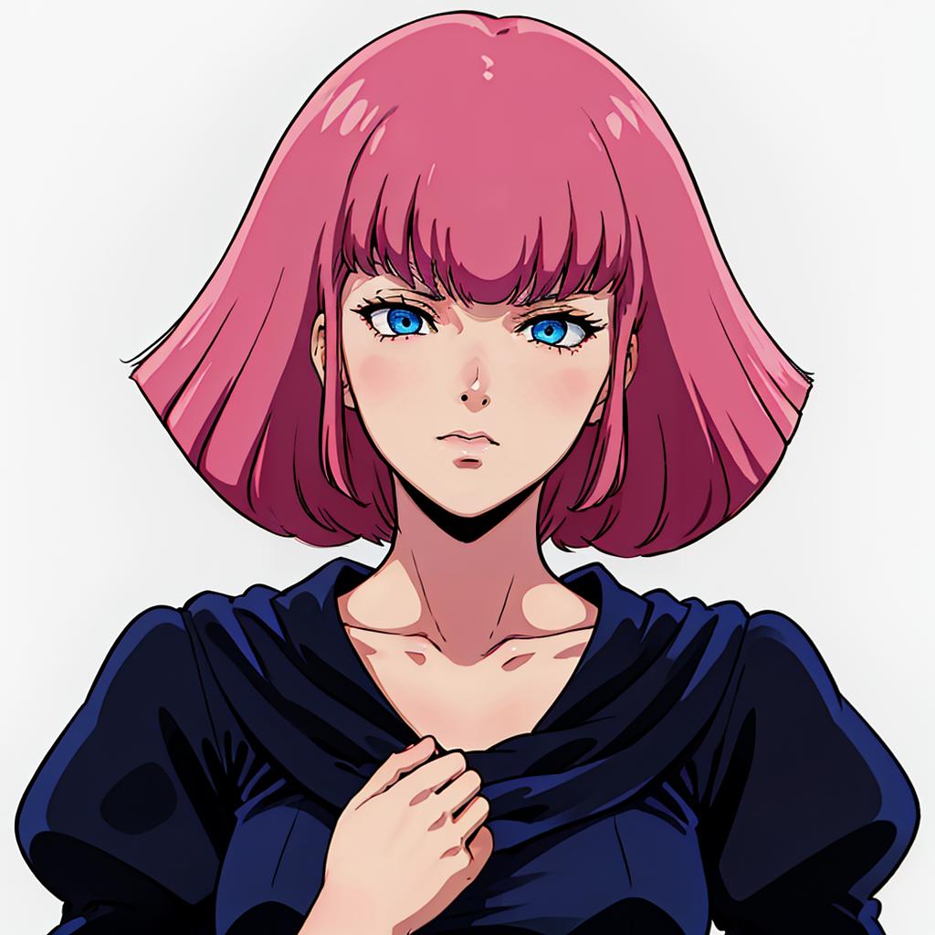 Appearance: pink hair,short hair,sidelocks,bangs,blue eyes,aged up,