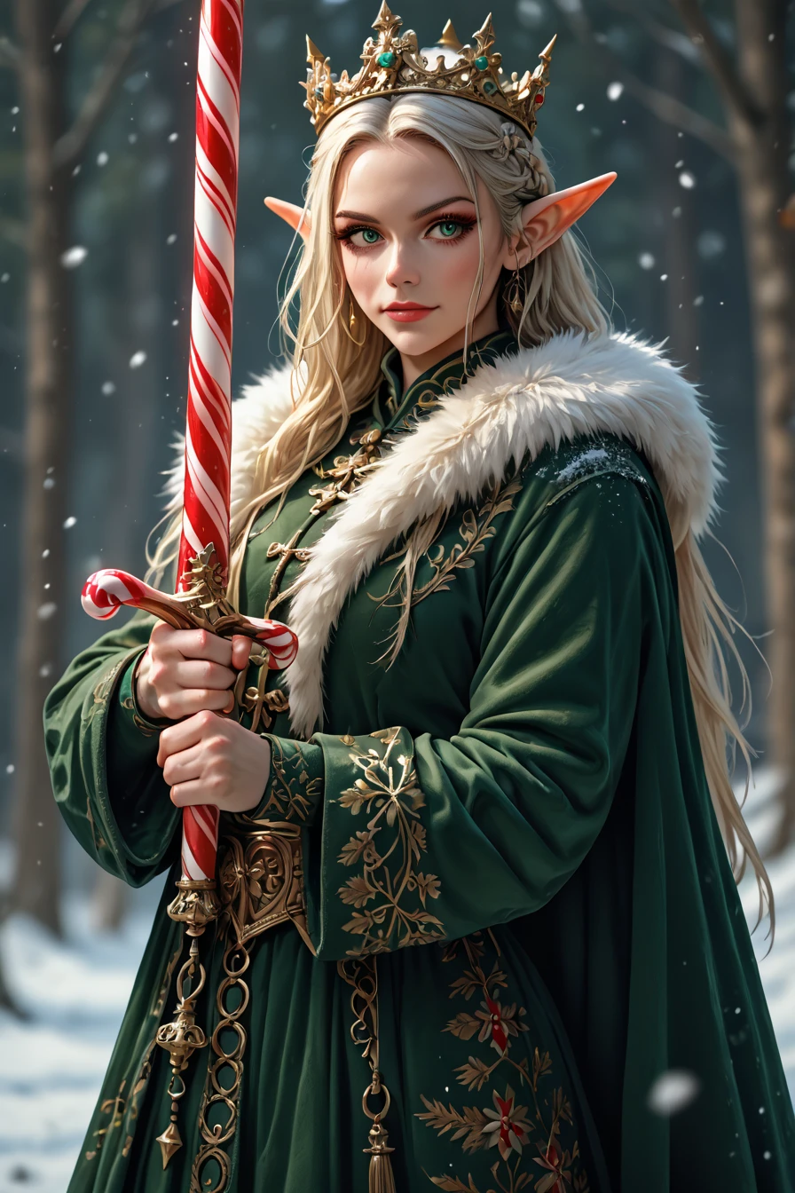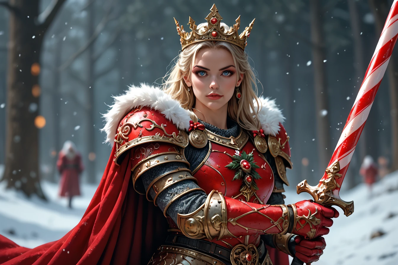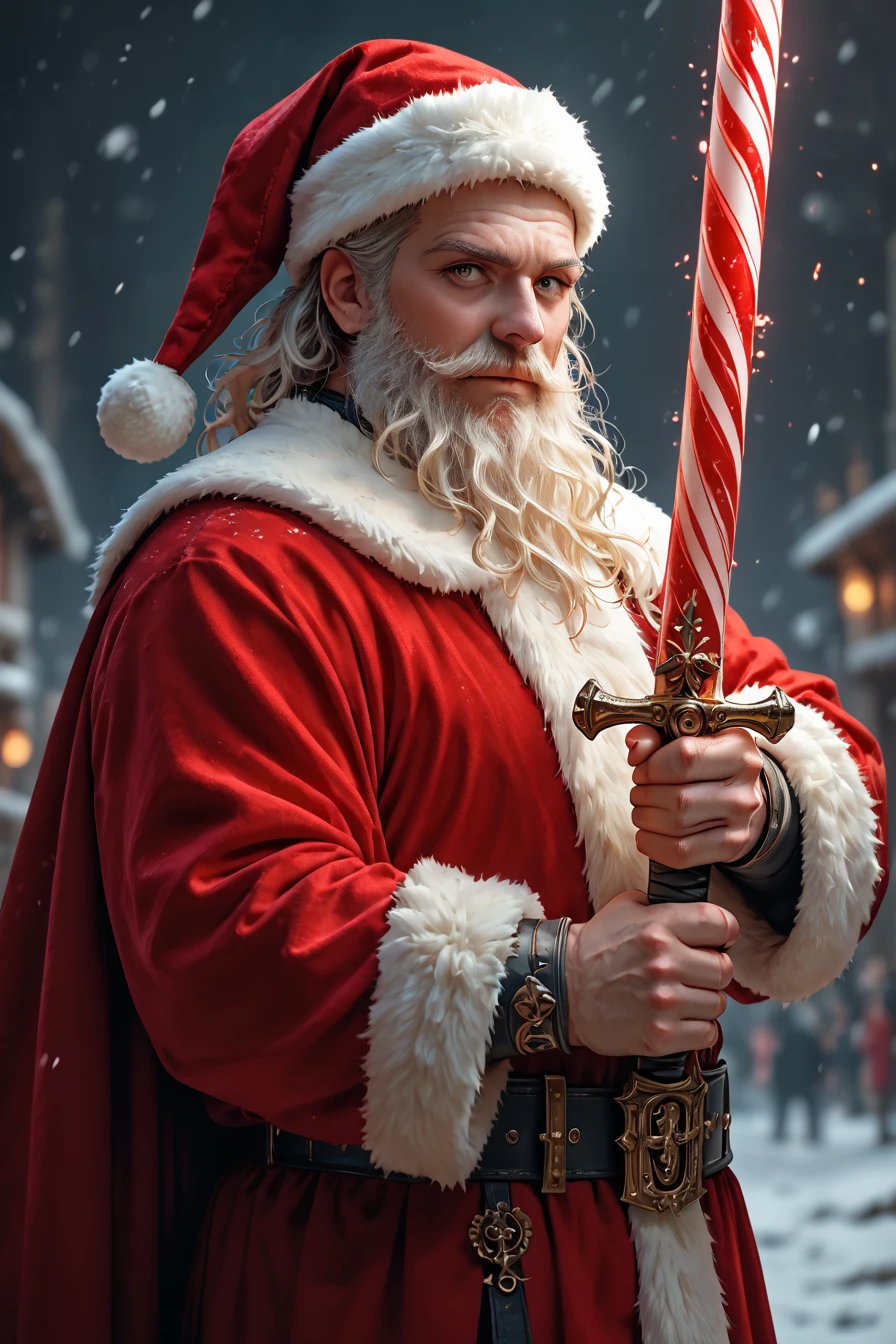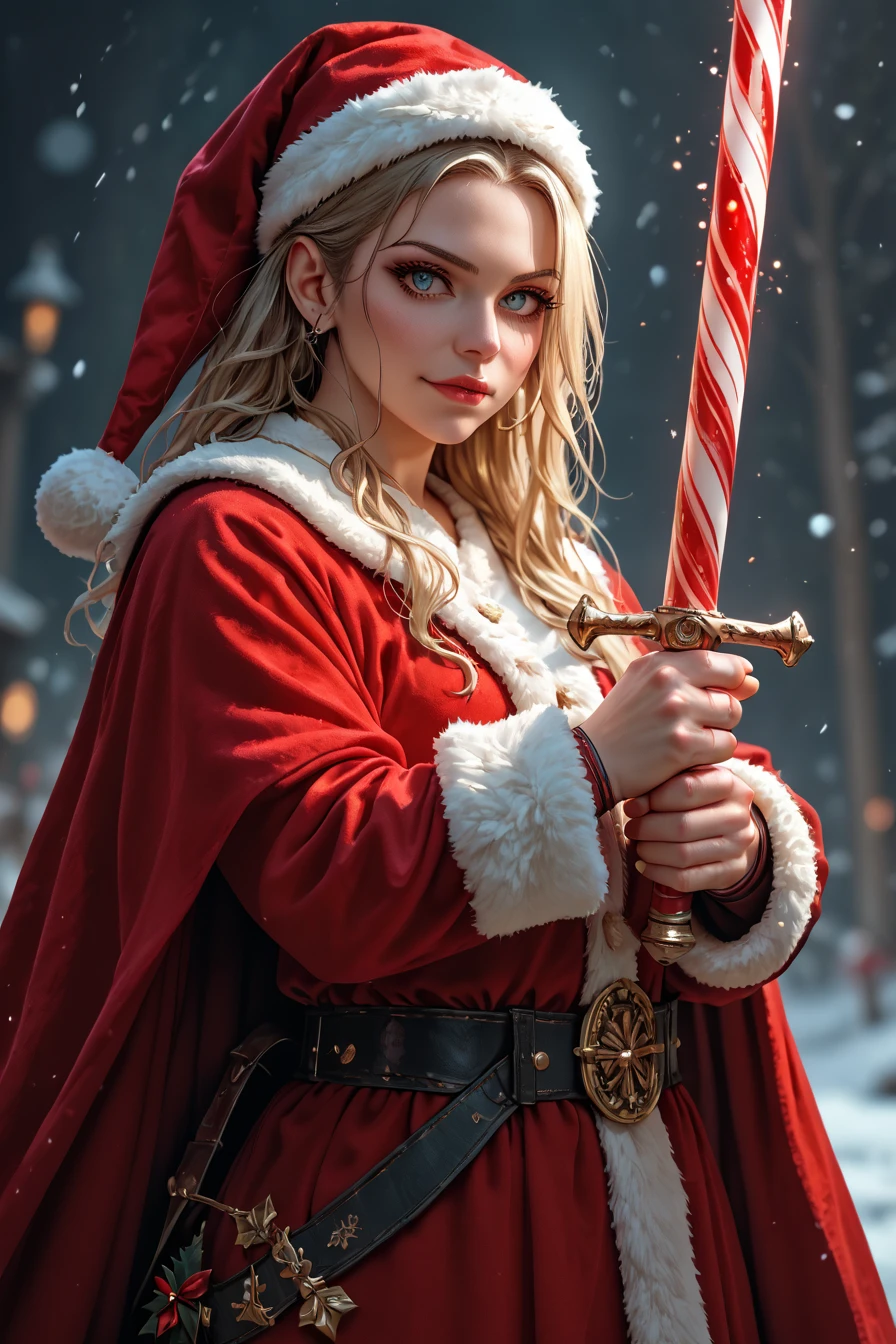 "score_9, score_8_up, score_7_up, upscale 2x, (a cinematic fullbody shot of female Santa Claus, wielding a sword made of candy cane, a candy cane sword, throneroom in background:1.2) amazing quality"