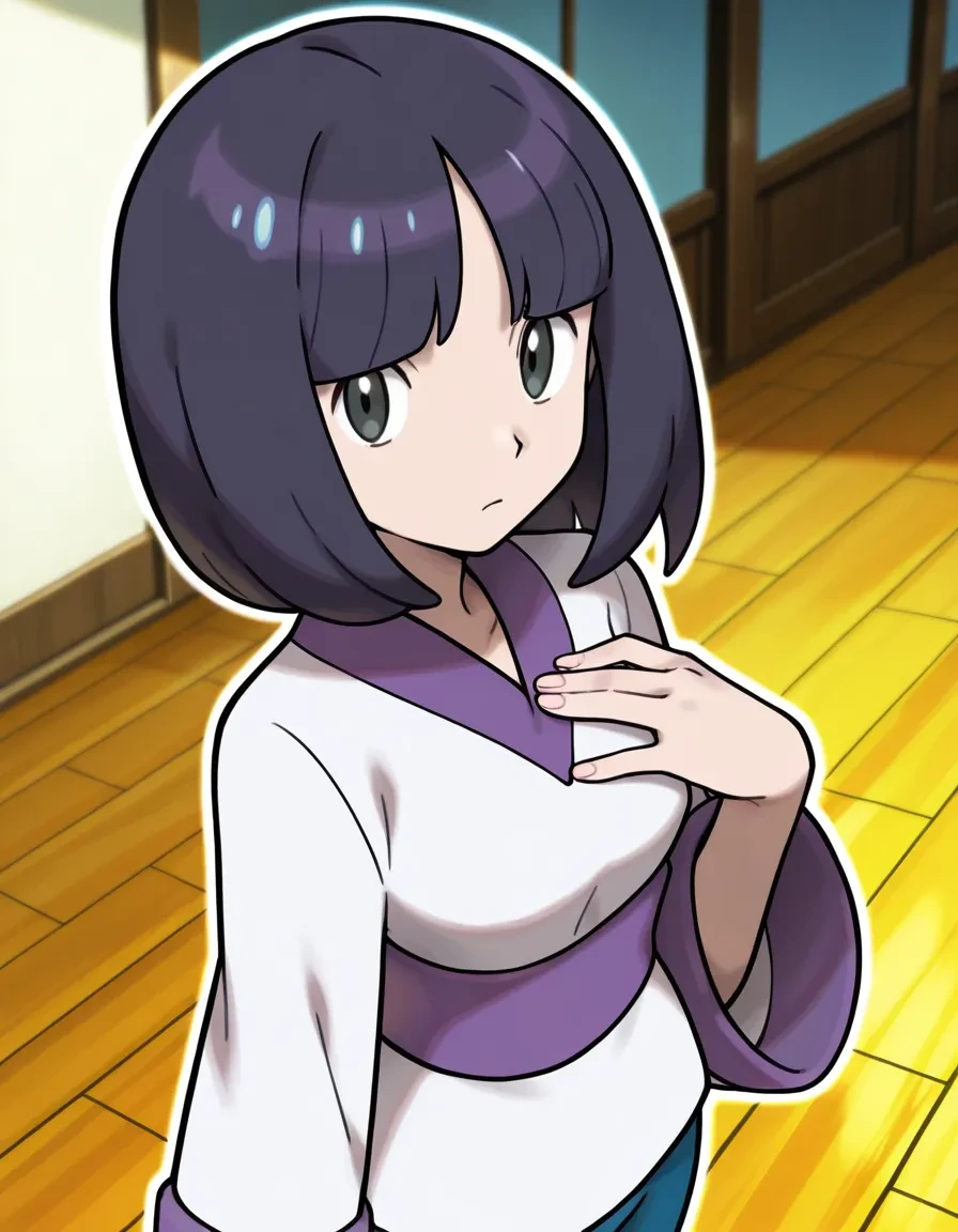 1girl,psfe,black hair,medium hair,purple hair,blunt bangs,parted bangs,bob cut,black eyes,