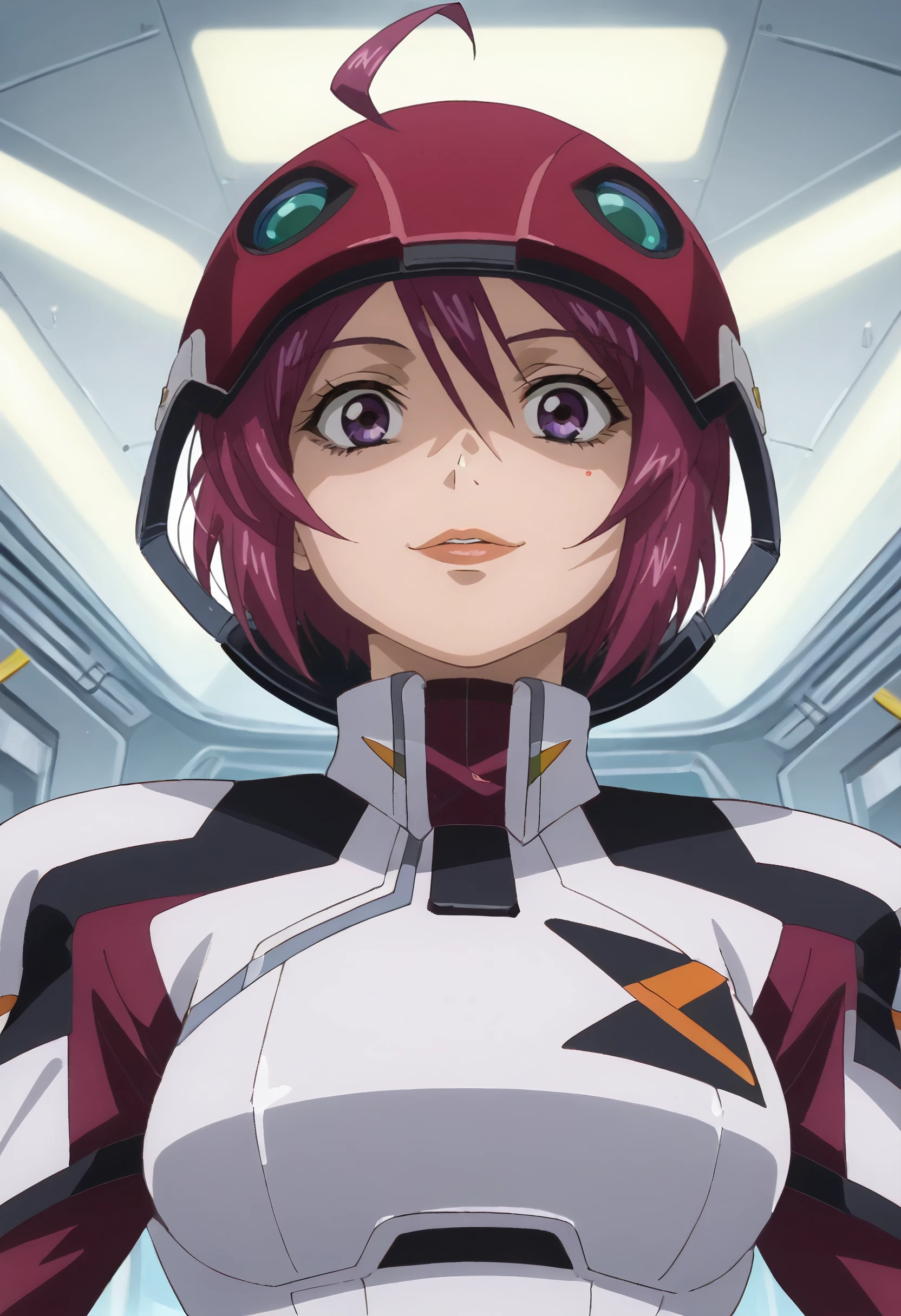 LunamariaSuit, helmet, uniform, red headwear, pilot suit, science fiction, mecha, pilot, spacesuit,