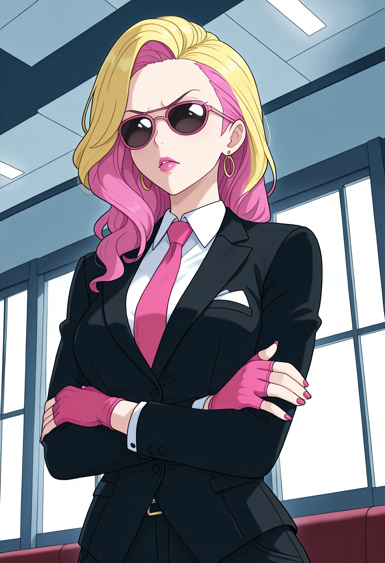The legendary transformed Ditto in a human woman form. Prompt is "MsN0rman, multicolored hair, two-tone hair." Use sunglasses and negative "visible eyes" if you want to not have human eyes.