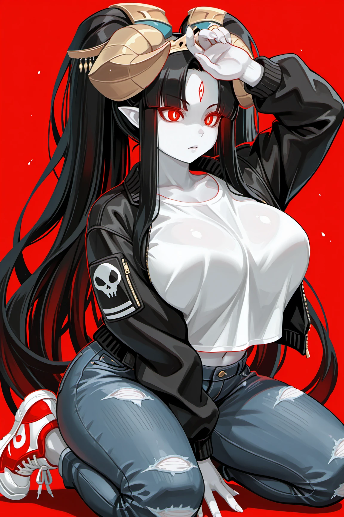 Trigger: pure_white_demon, 1girl, solo, breasts, red eyes, large breasts, long hair, horns, pointy ears, black hair, nude, nipples, colored skin, demon girl, pale skin, hand on chest, forehead third eye,