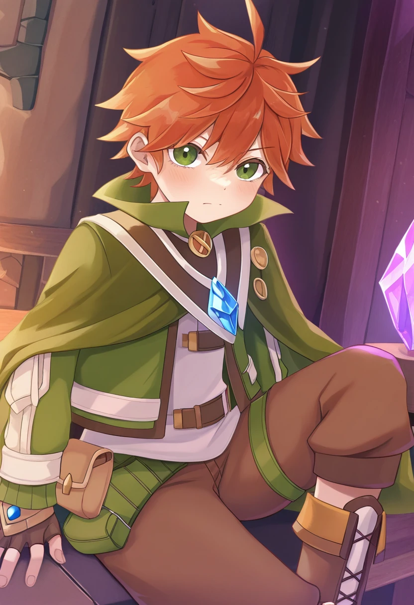 ritmo\(lanota\), 1boy, short hair, brown hair, green eyes, ahoge, white shirt, fingerless gloves, orange hair, jewelry, brown gloves, pouch, green jacket, brown shorts, belt pouch, green cape, green belt, shirt belt, brown belt, necklace, thigh strap, shirt belt, brown belt, brown boots