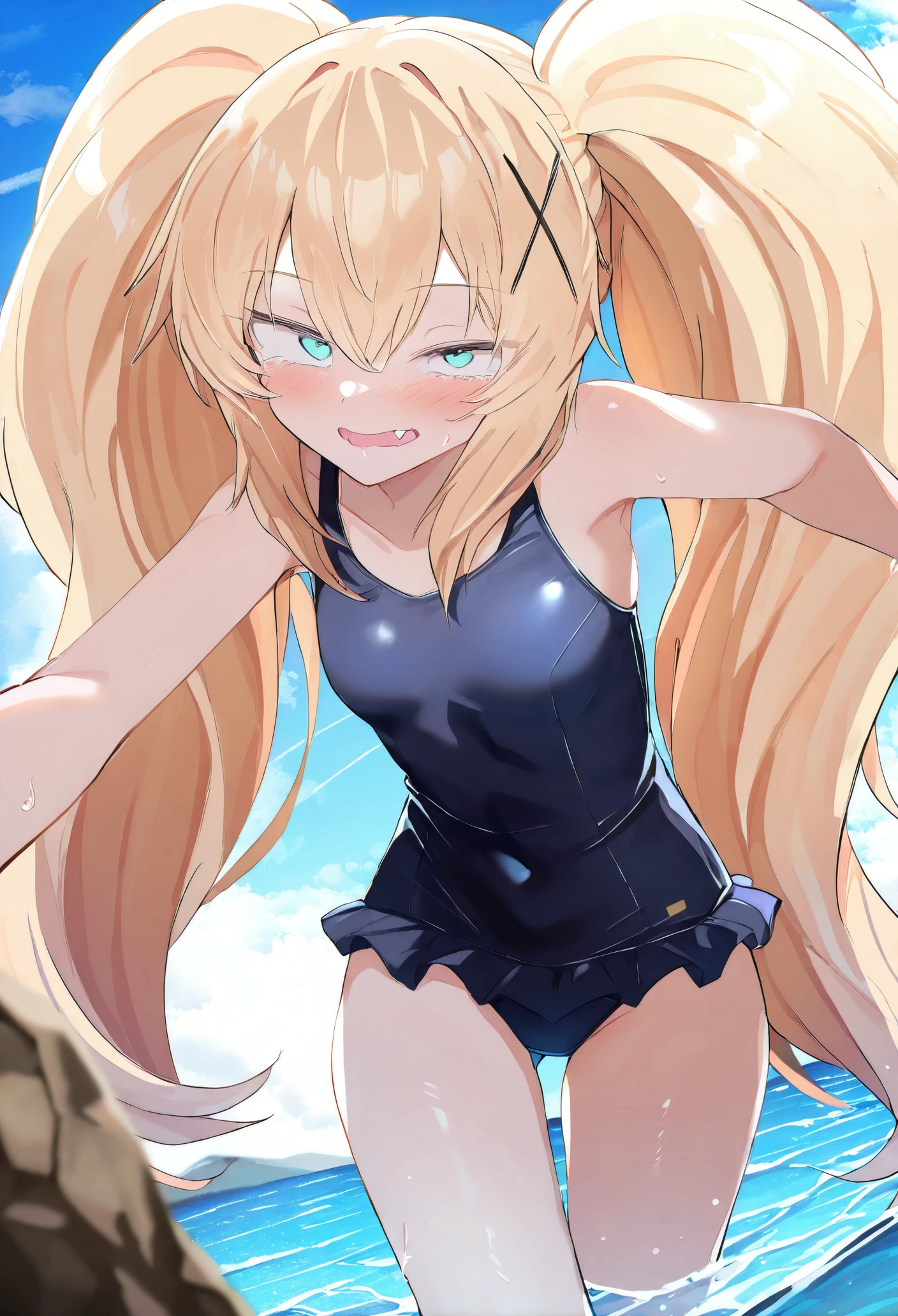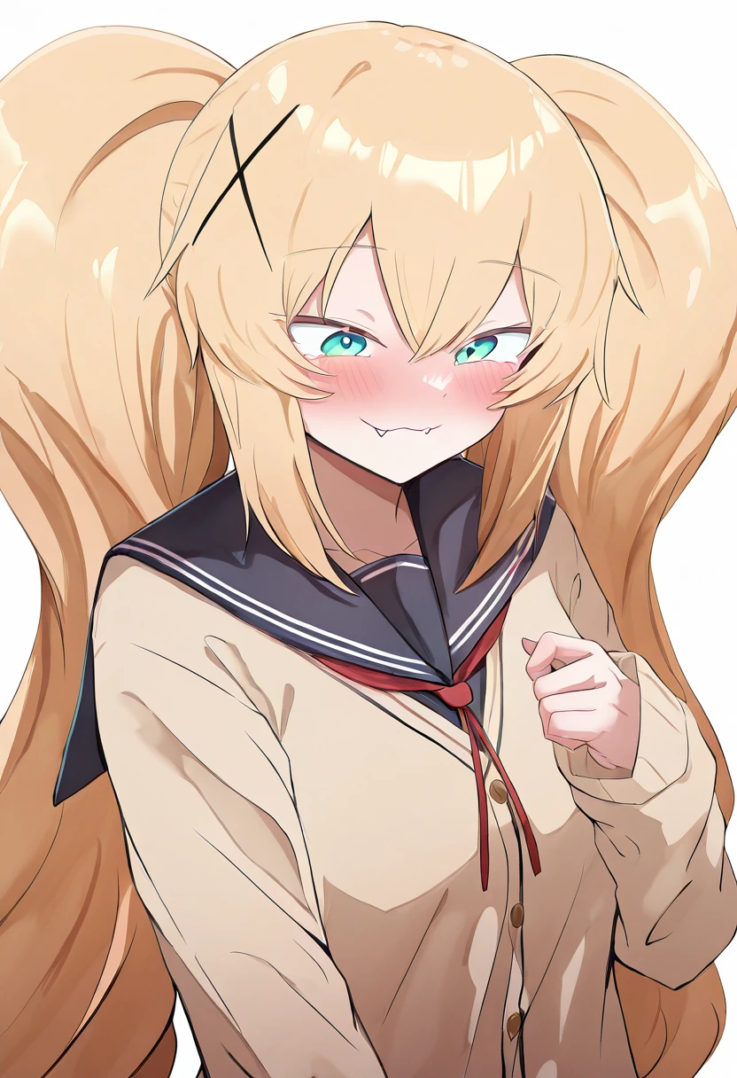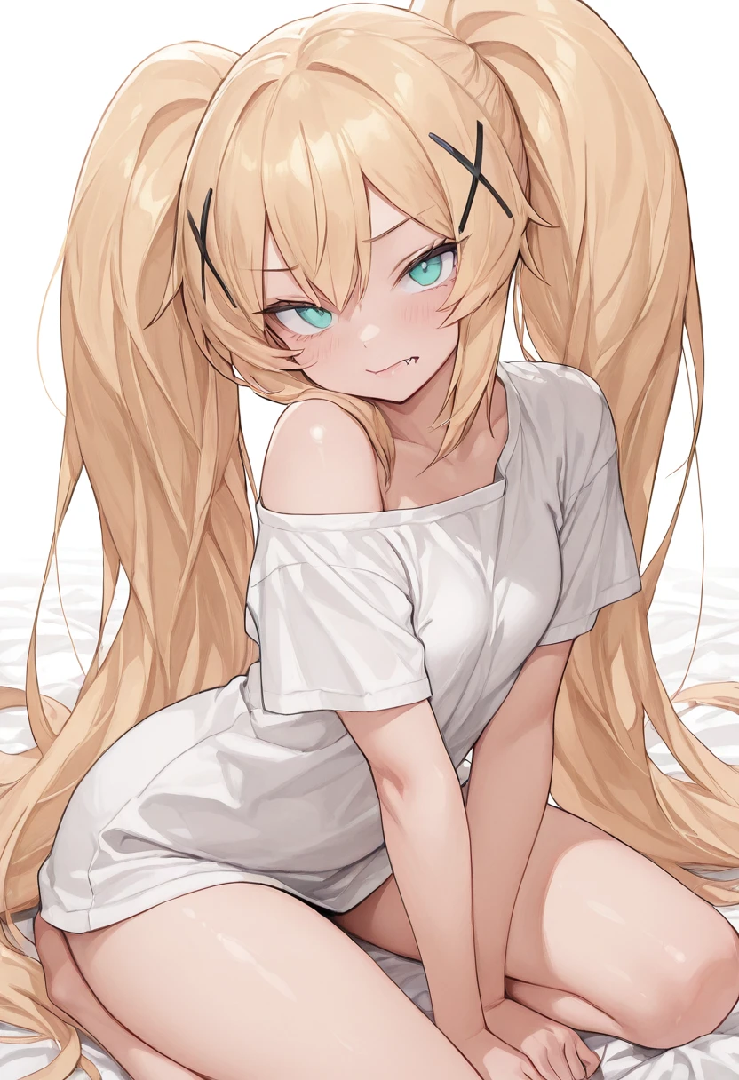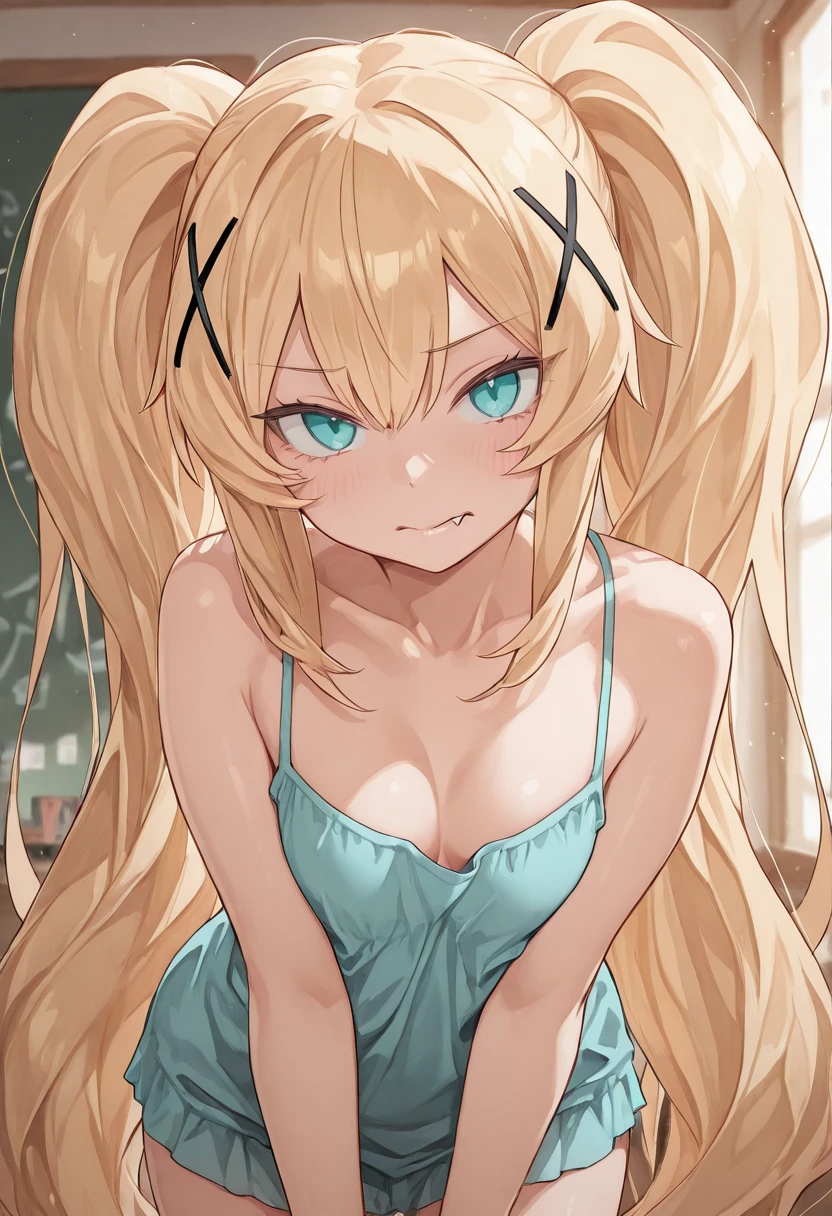 very long hair, twintails, aqua eyes, blonde hair, x hair ornament, fang,