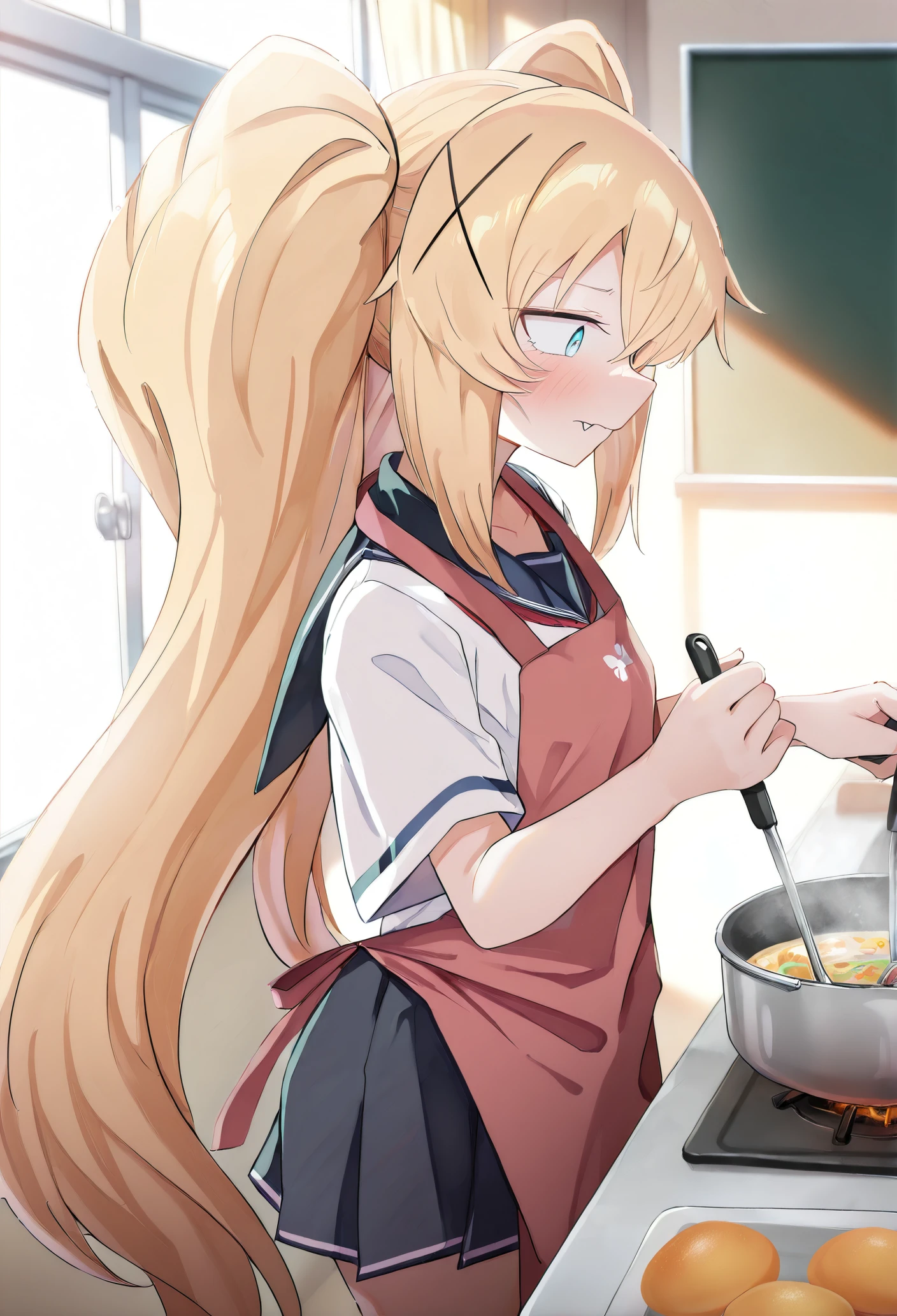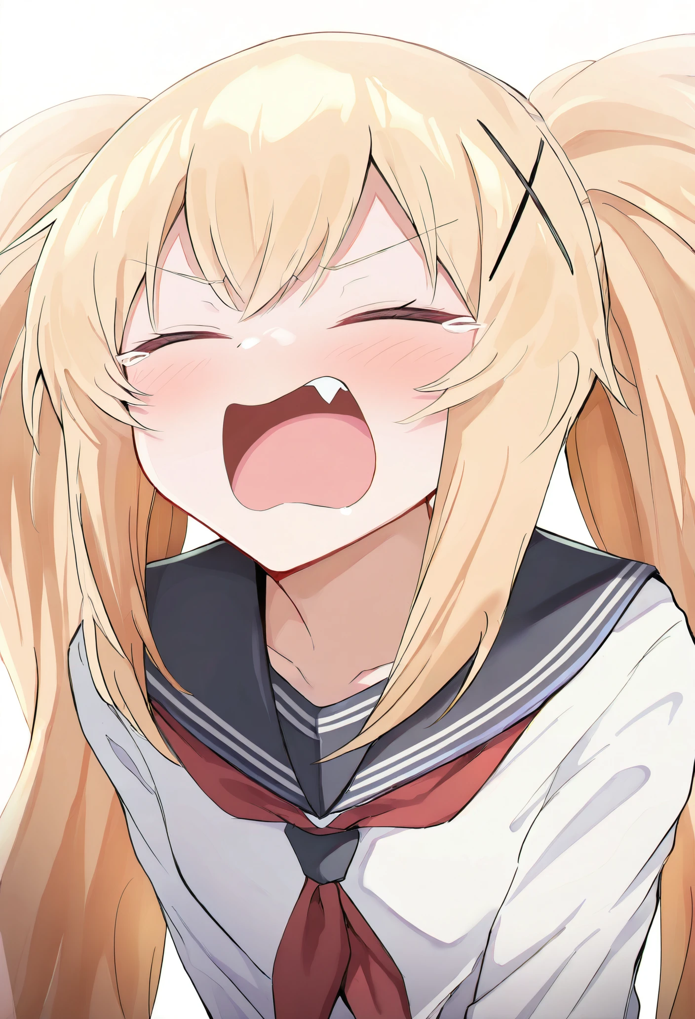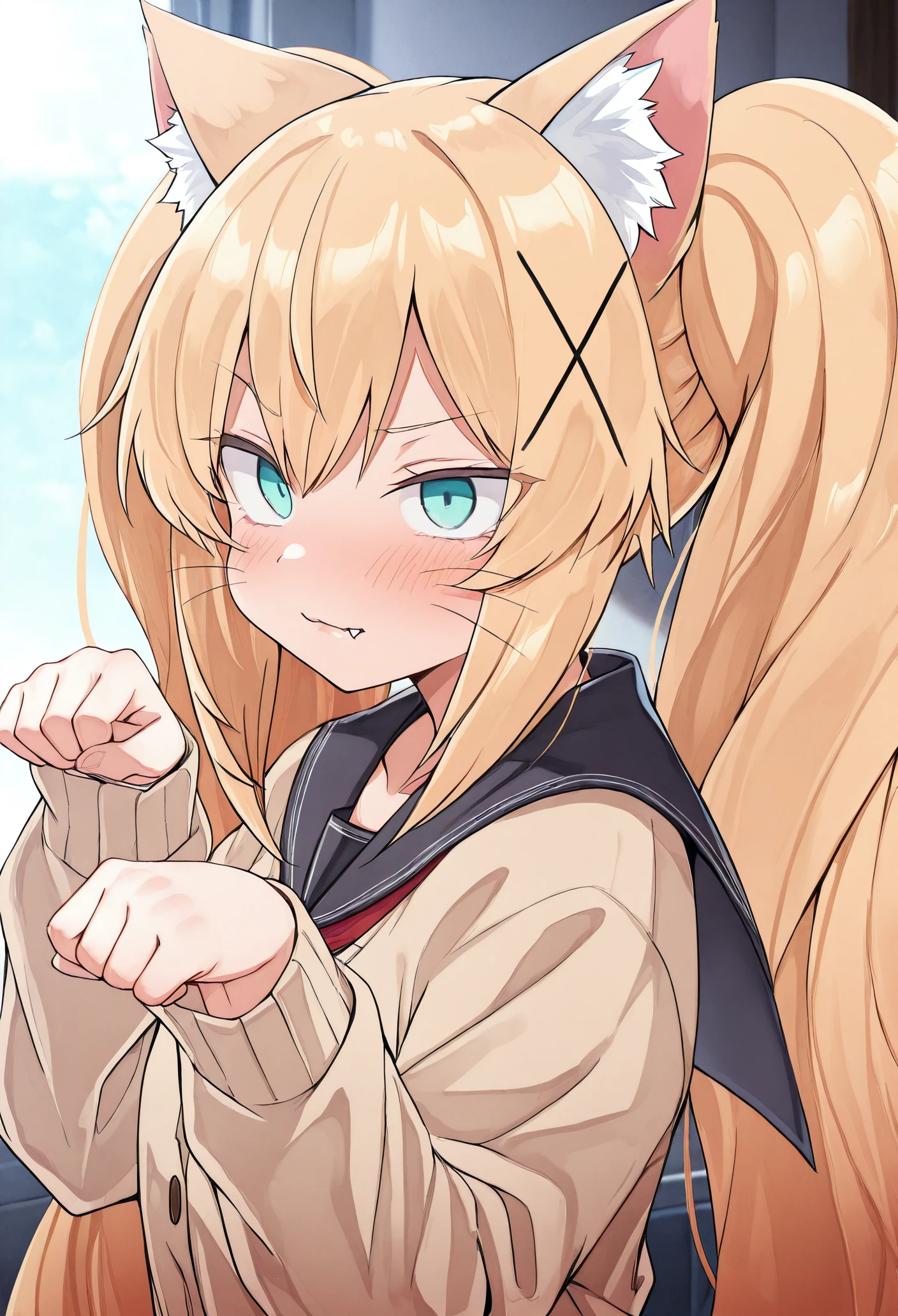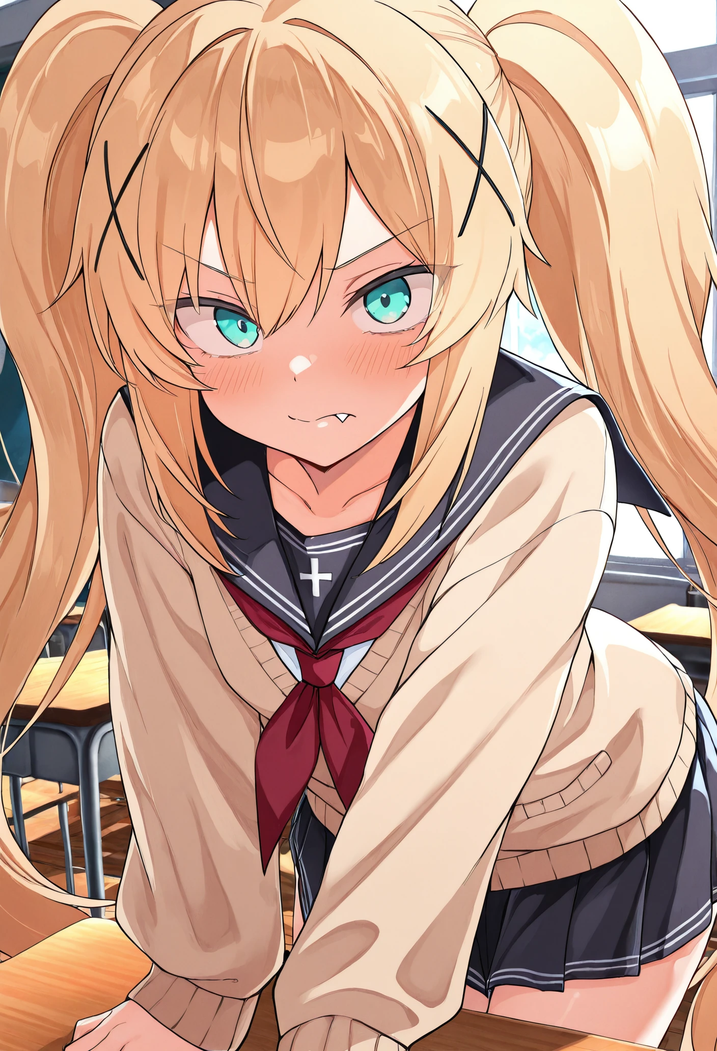 very long hair, twintails, aqua eyes, blonde hair, x hair ornament, fang,