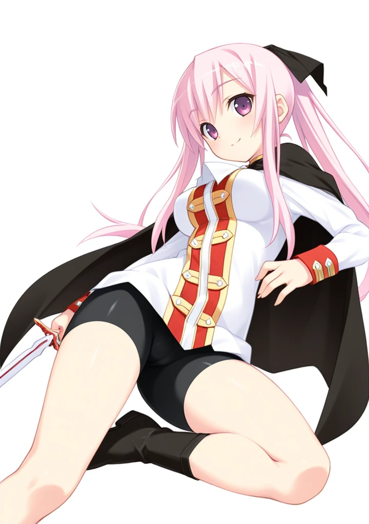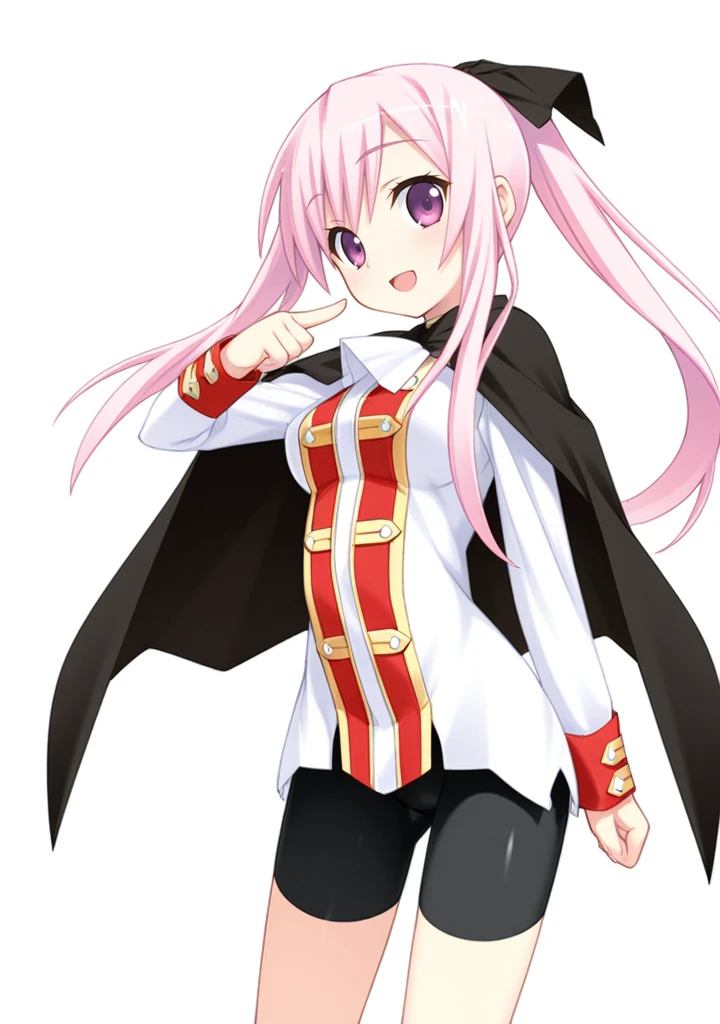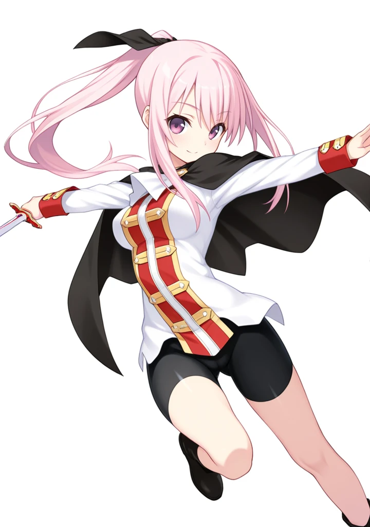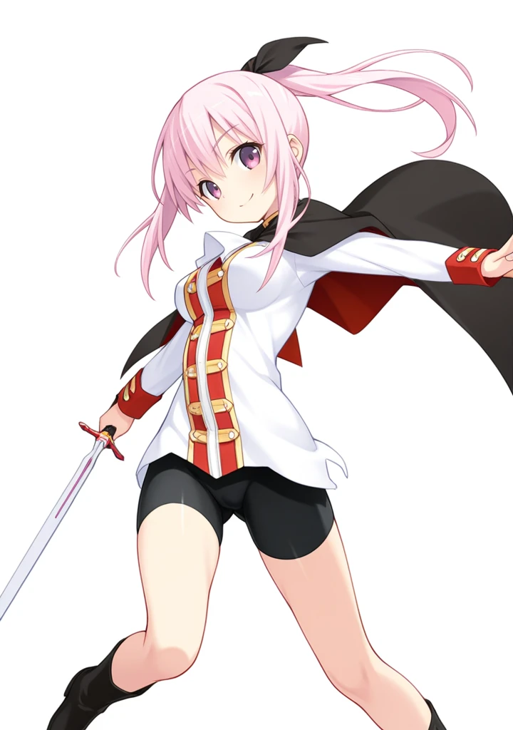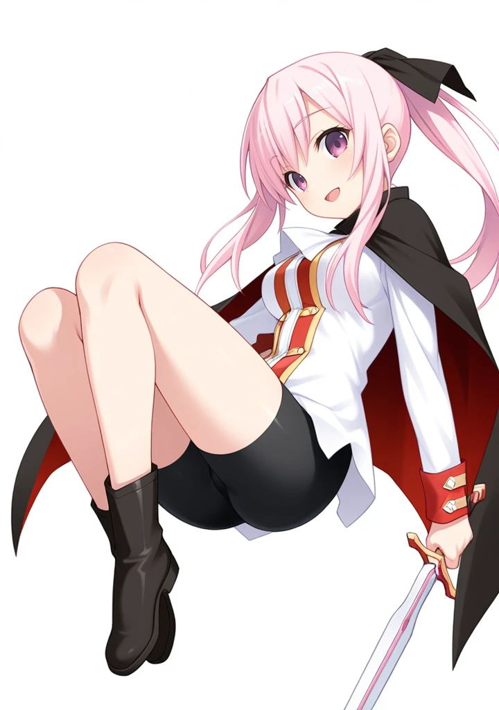 nanaka-tc,pink hair,pink eyes,purple eyes,long hair,ponytail,medium breasts,hair ribbon,white shirt,black cape,long sleeves,bike shorts,black shorts,boots,black footwear,skin tight,
