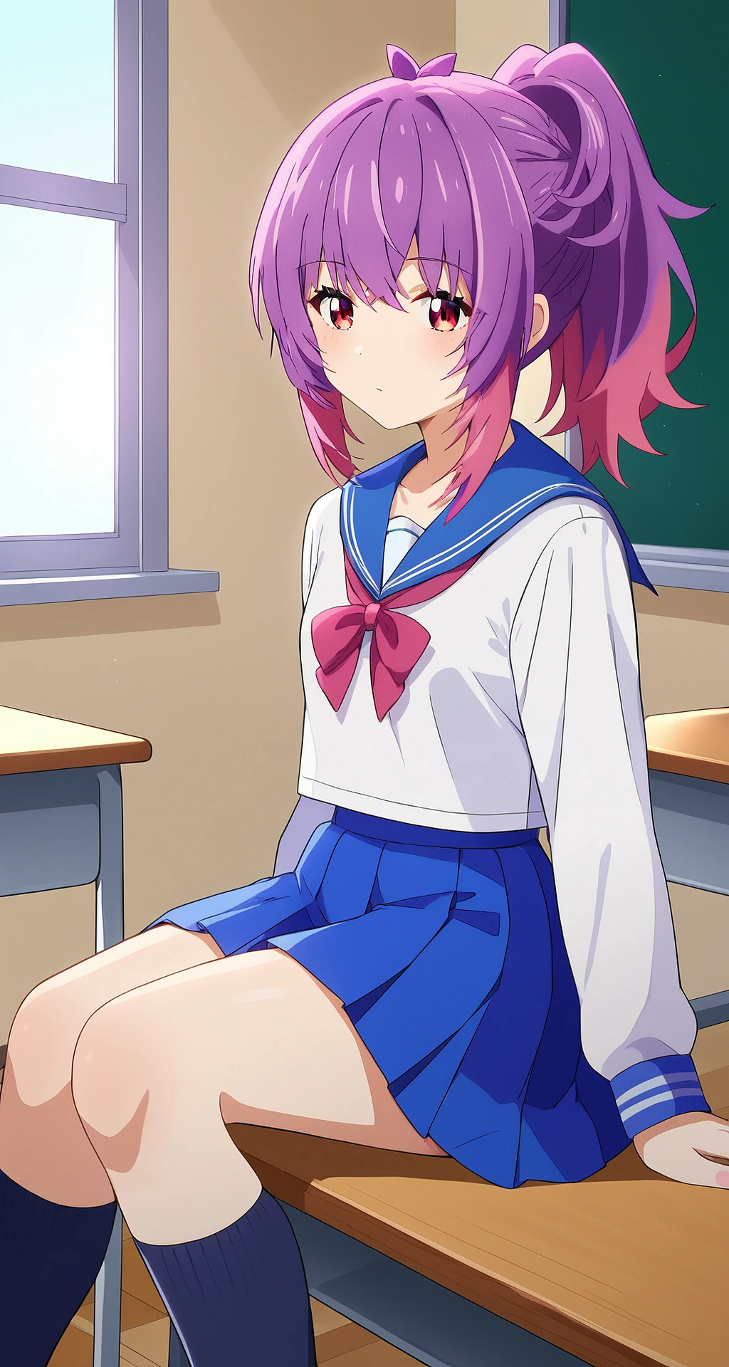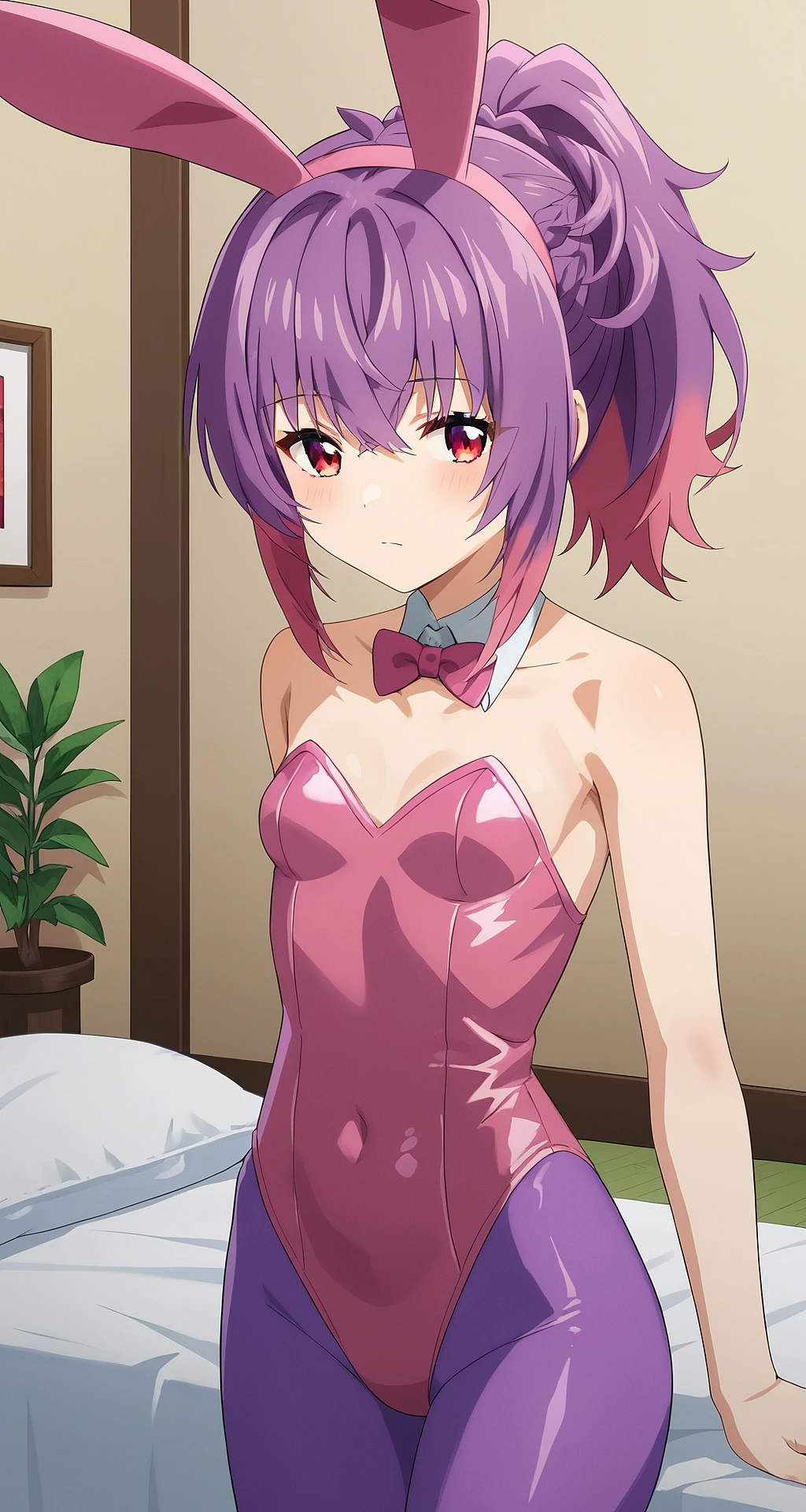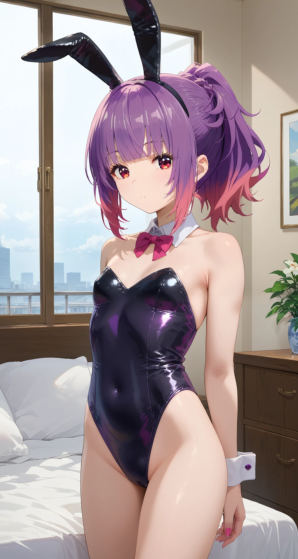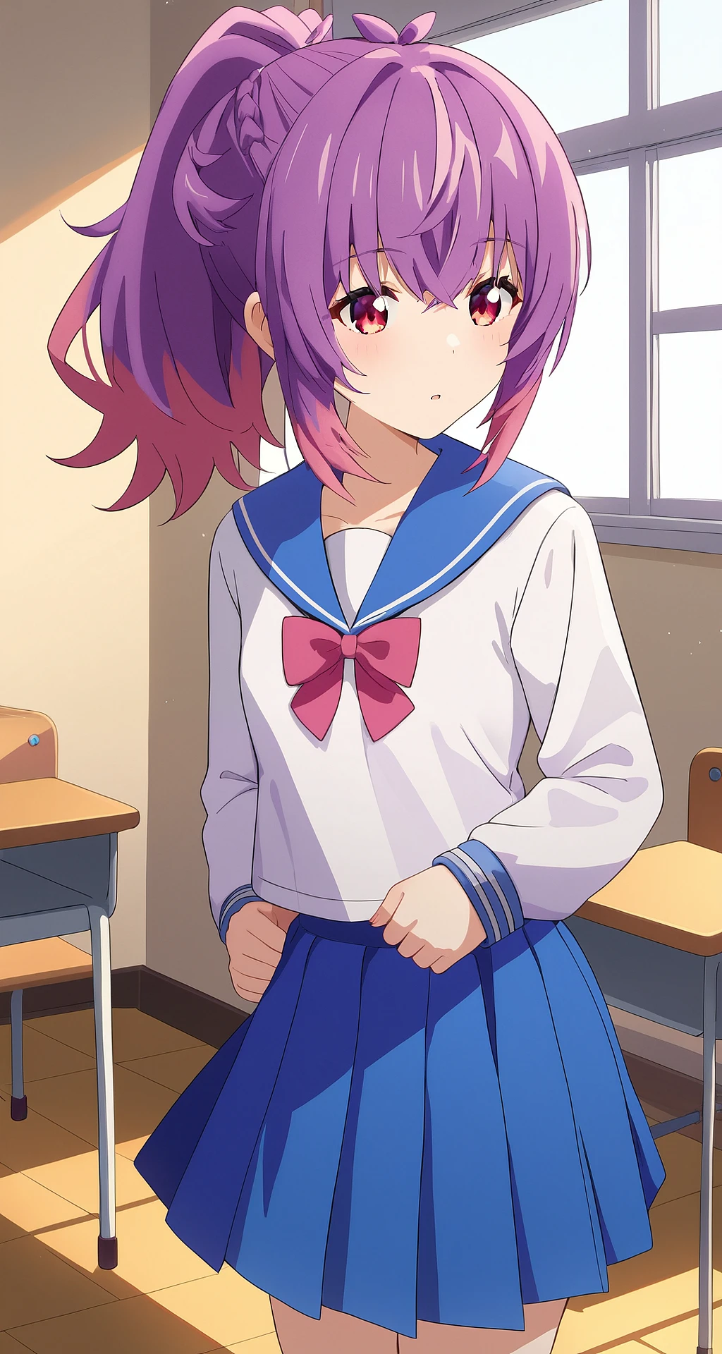kurage_aoba, ponytail, haribangs, two-tone hair, purple hair, pink hair, red eyes, small breast,