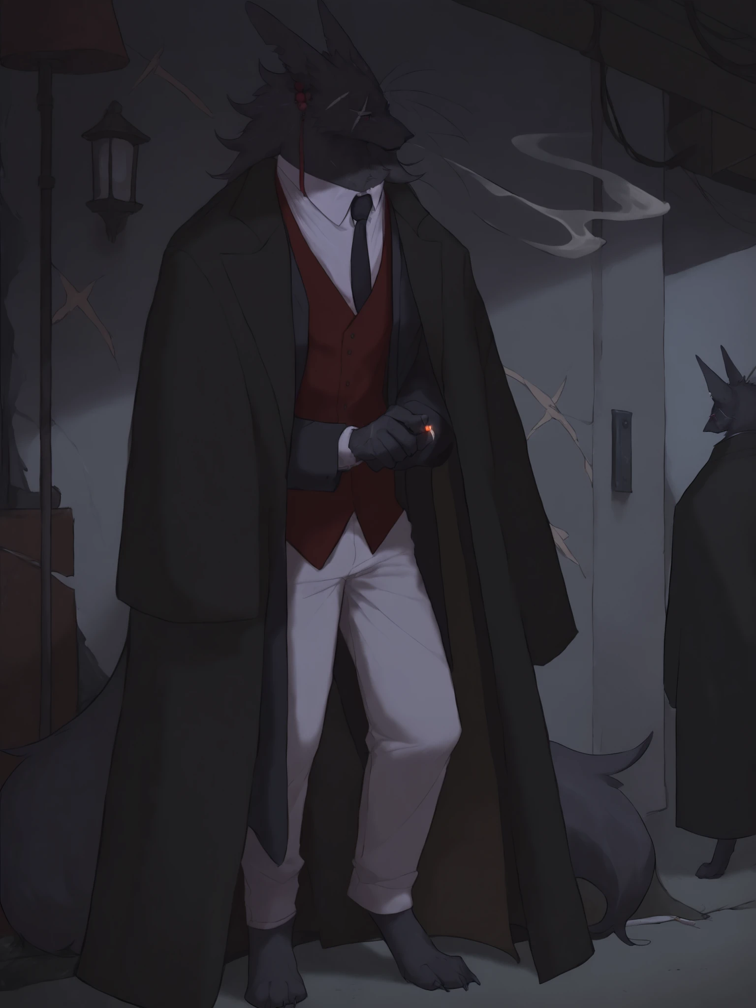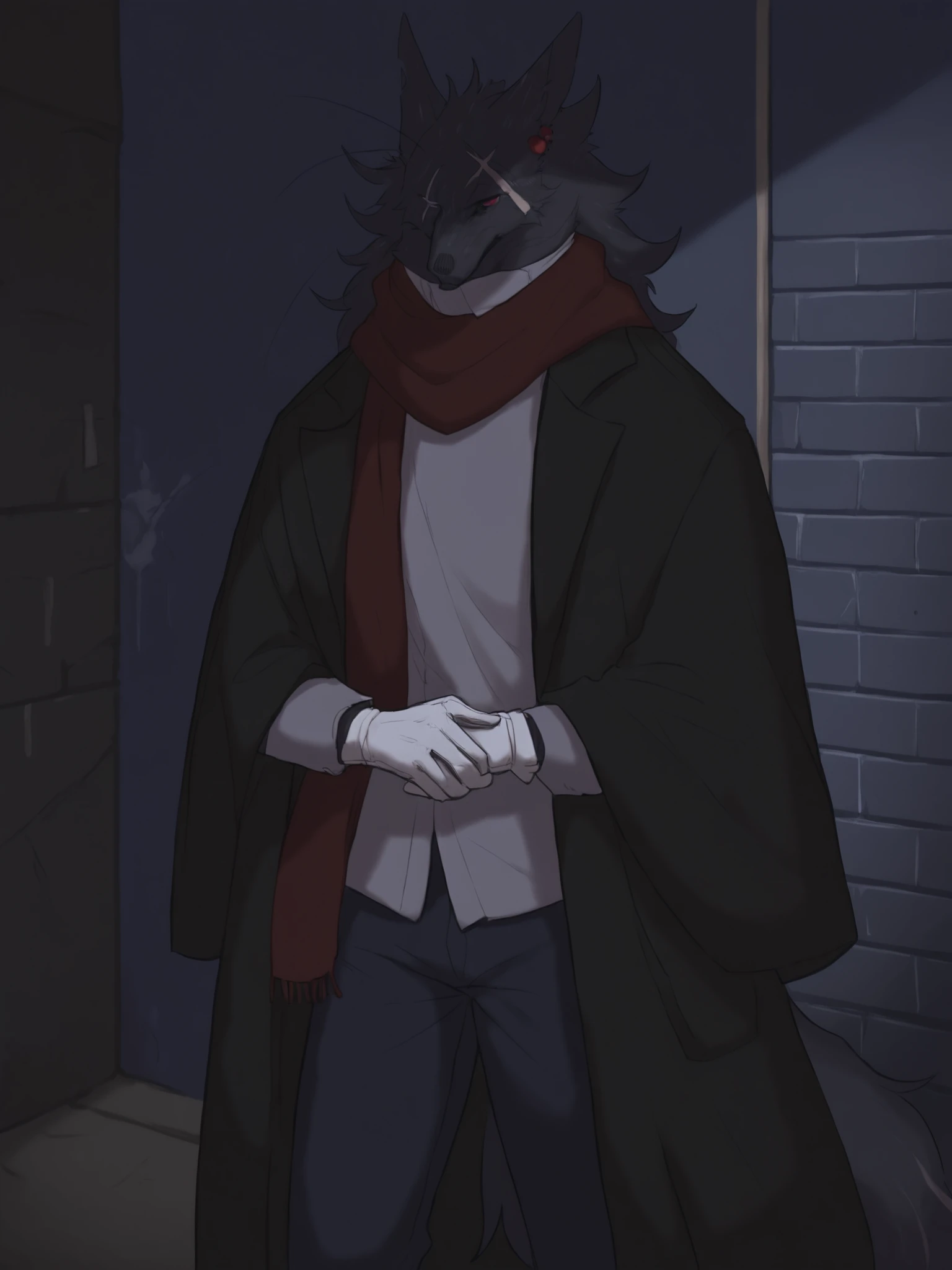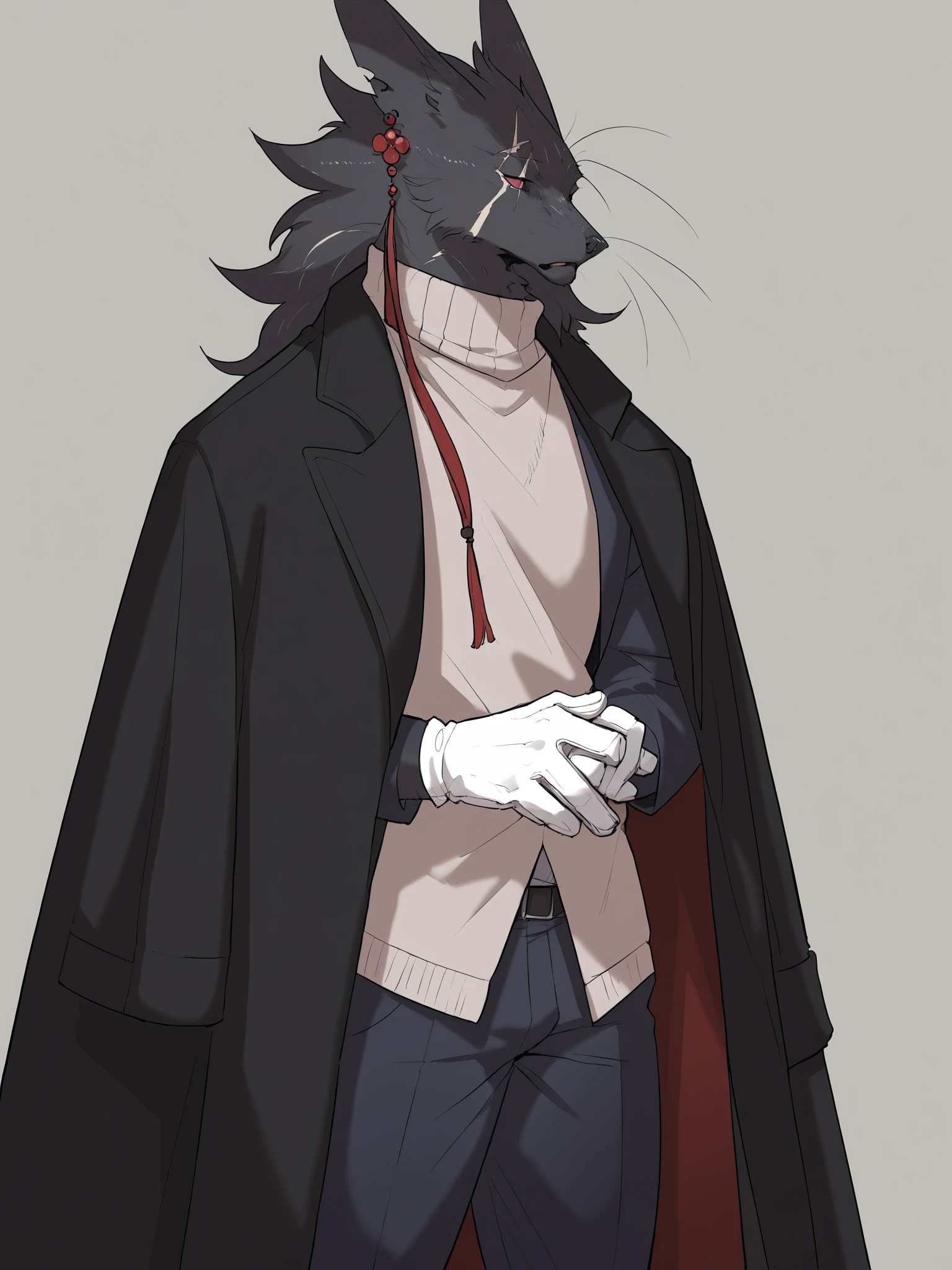 raven, furry male, black body, scars, mature male, long ears, fluffy, ((closed right eye)), hair ornament, red eyes, white pupils,