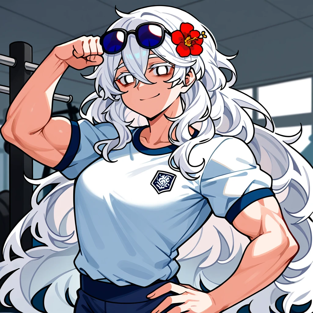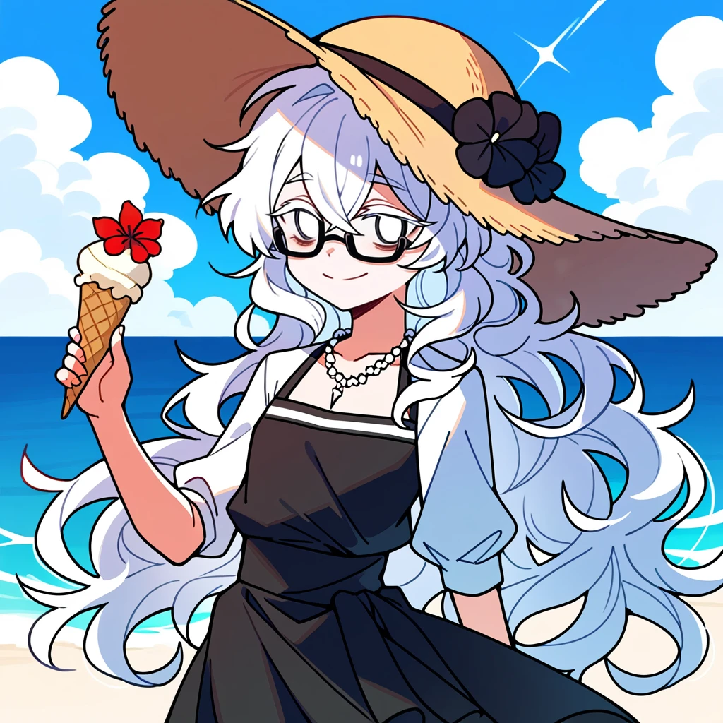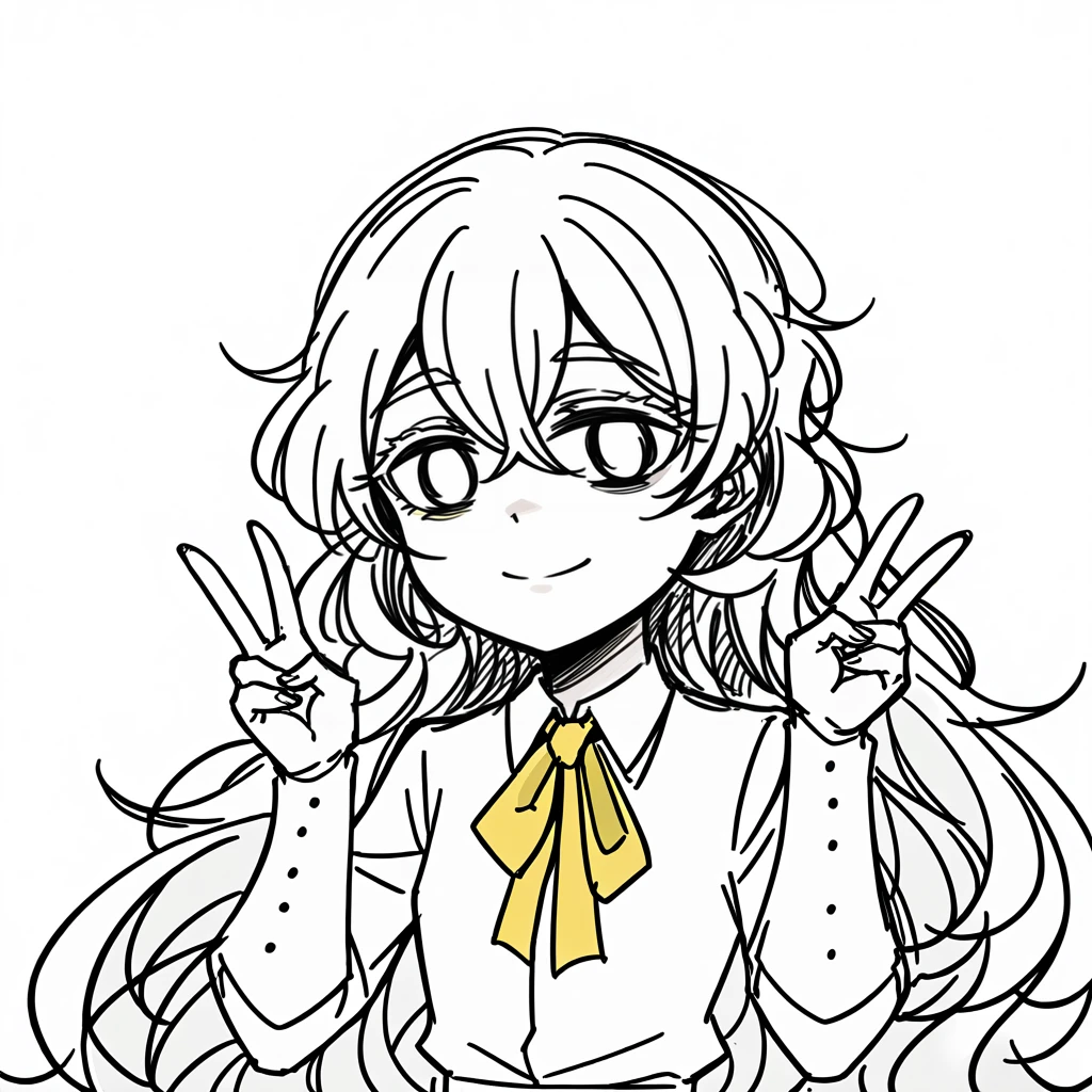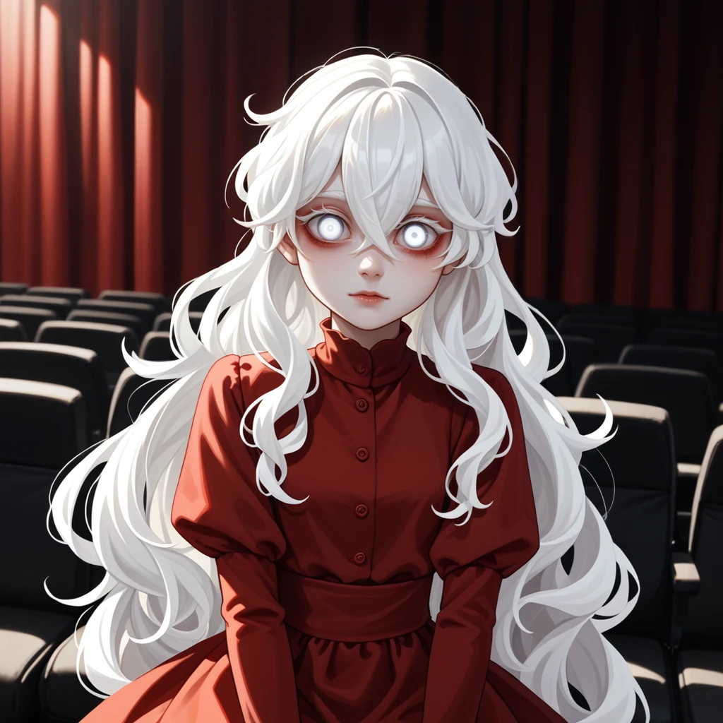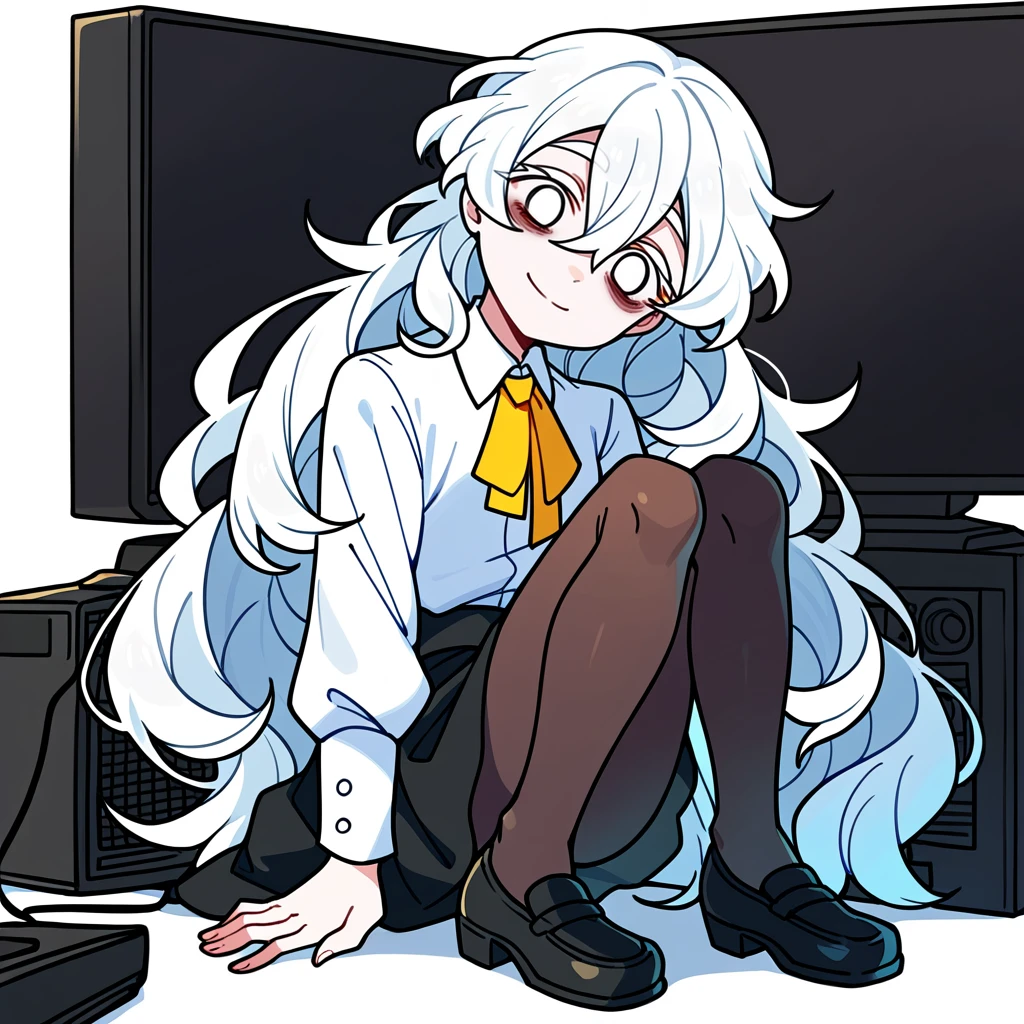 white hair,long hair,wavy hair,hair between eyes,white eyes,empty eyes,bags under eyes,colored eyelashes,white dress shirt,long sleeves,yellow neck ribbon,black skirt,pantyhose,black footwear,