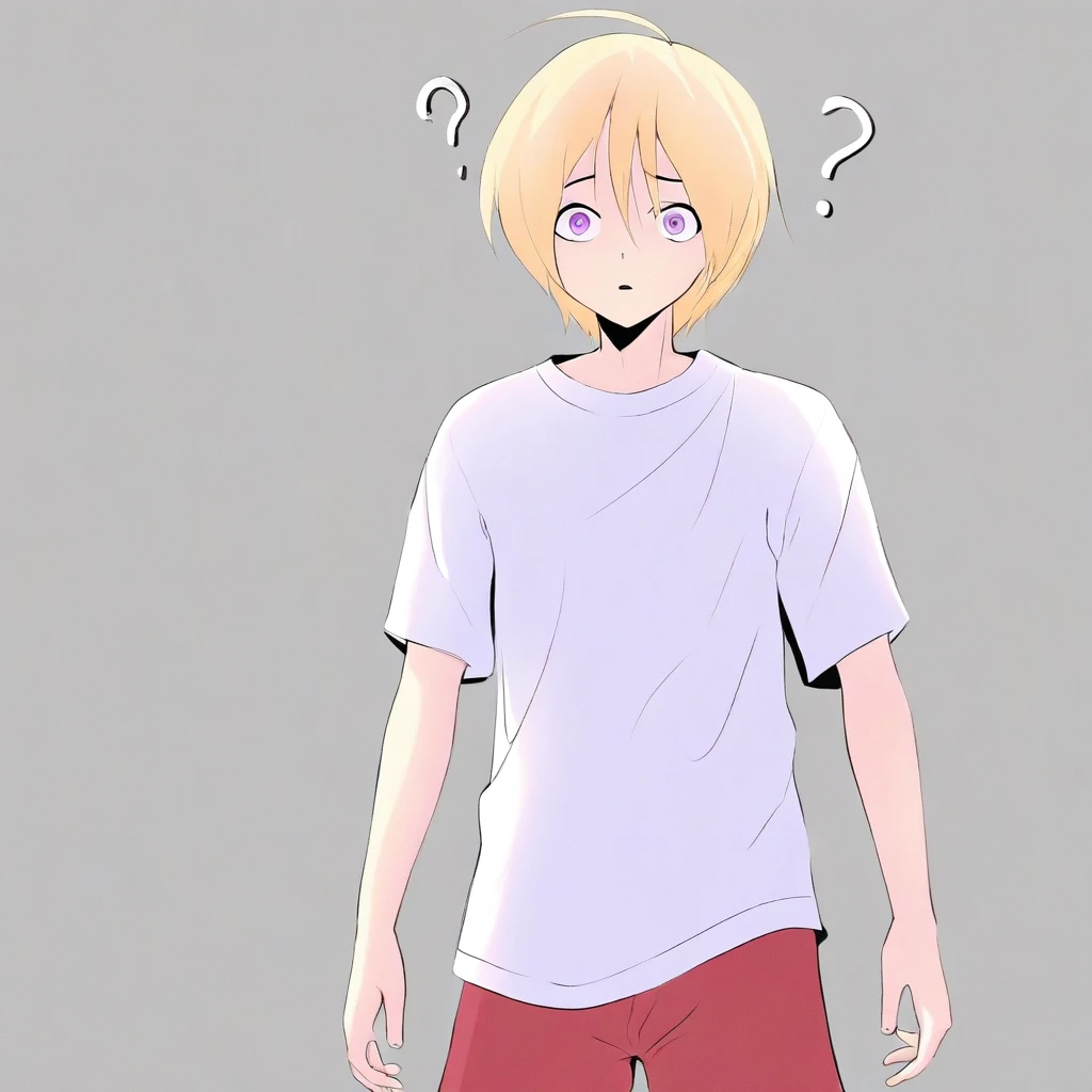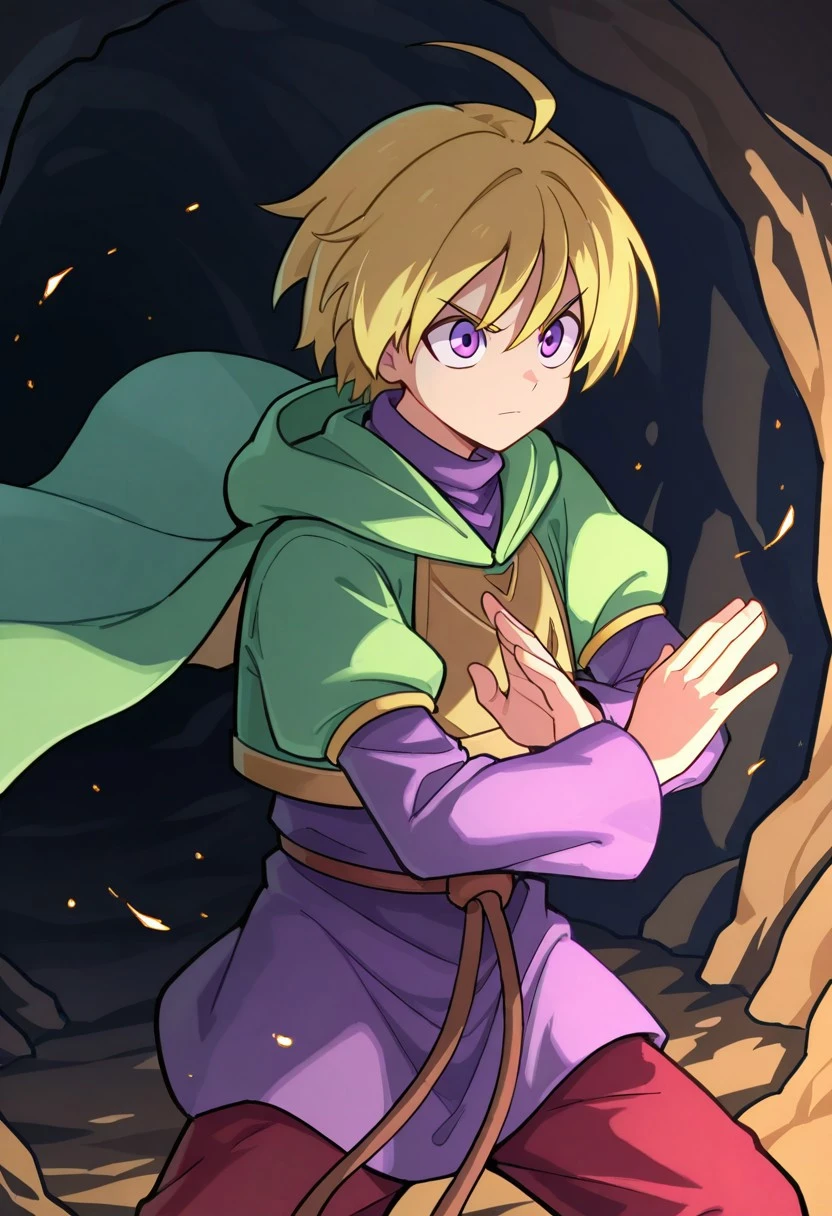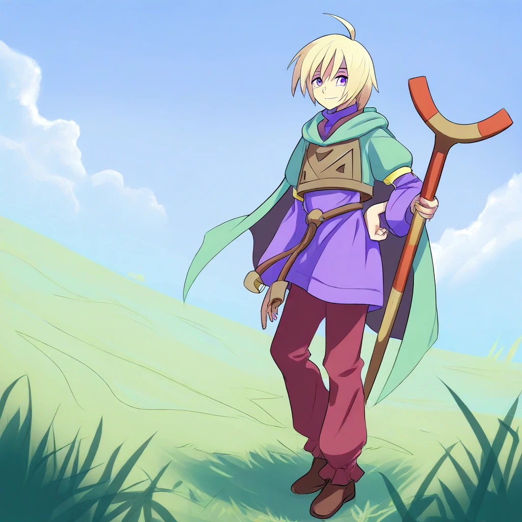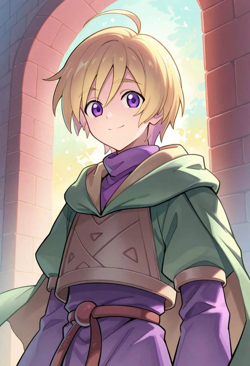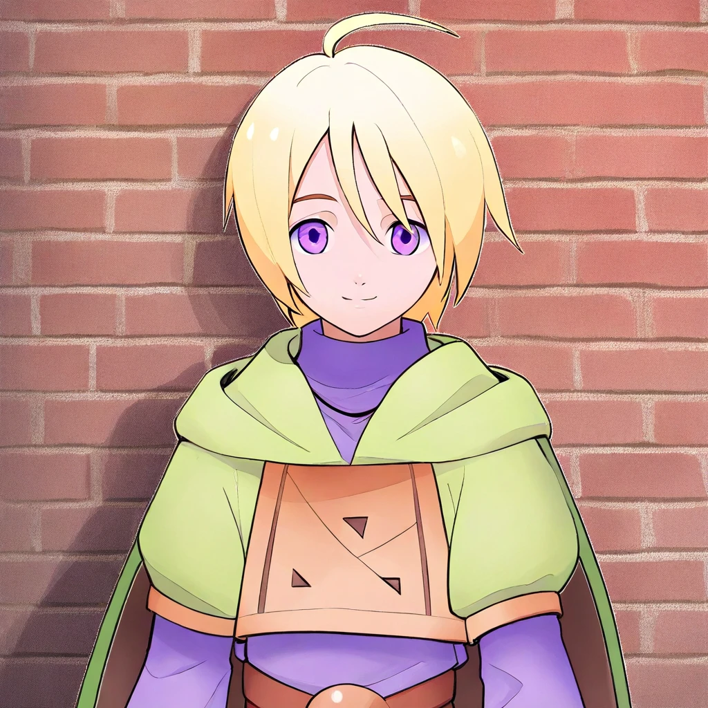G_S_J_A, ahoge, blonde hair, short hair, purple eyes,