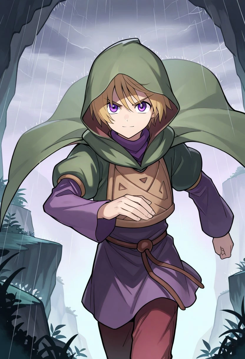 green cloak, hooded cloak, purple tunic, short sleeves over long sleeves, sash, red pants, brown shoes