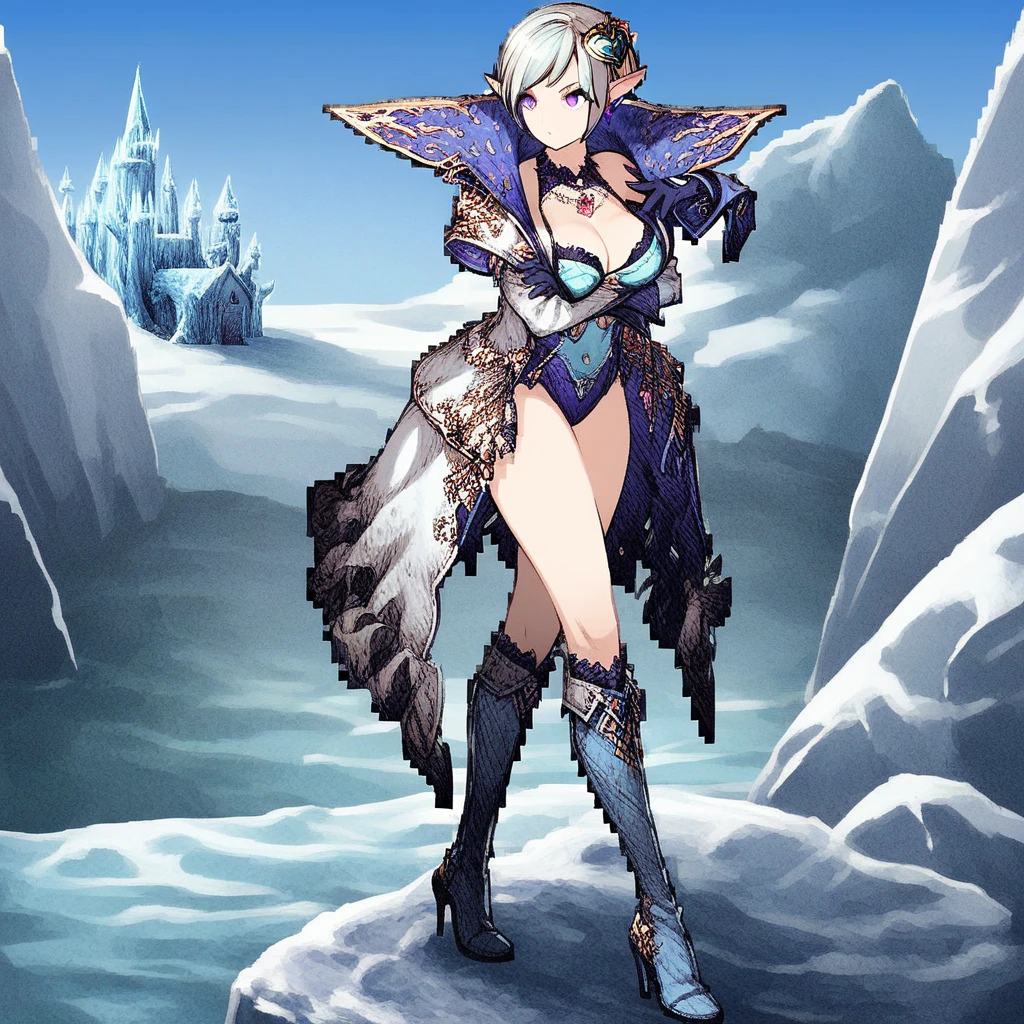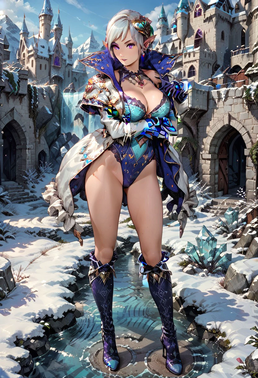fryevia, 1girl, solo, white hair, purple_eyes, pointy ears, leotard,panties under leotard, multicolored jacket, boots, knee warmers, necklace, hair ornament, gloves, elf, short hair, earrings, large breasts, jewelry,high heels, sexy bra, cleavage