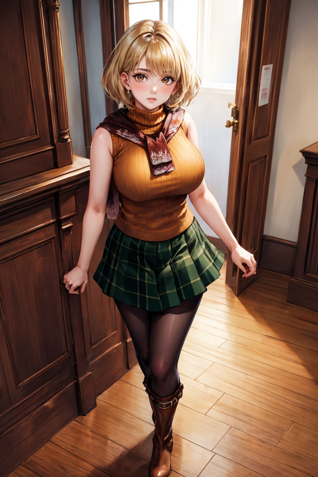 brown eyes, bangs, red scarf, orange sweater, sleeveless turtleneck, green miniskirt, belt, pantyhose