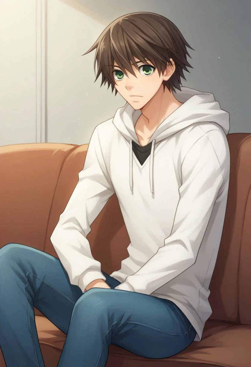 Casual #2 - misaki, 1boy, male focus, green eyes, brown hair, hood, pants, jacket, hoodie, jeans,