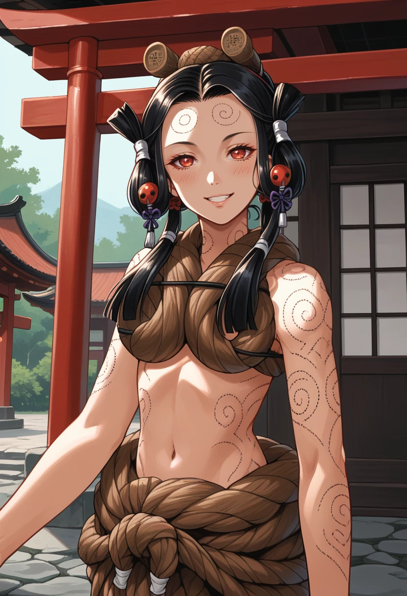 Tags: izanamismt, black hair, hair ornament, red eyes, rope, full-body tattoo, navel, barefoot