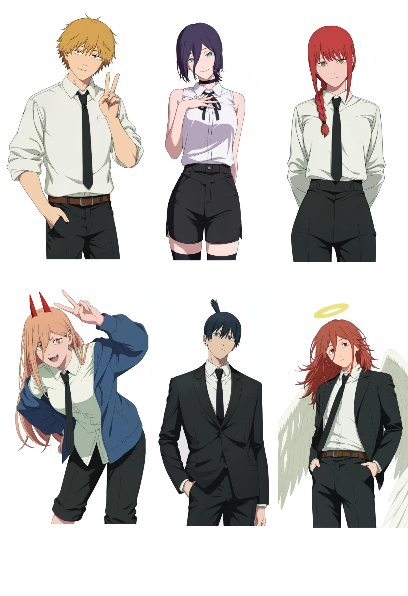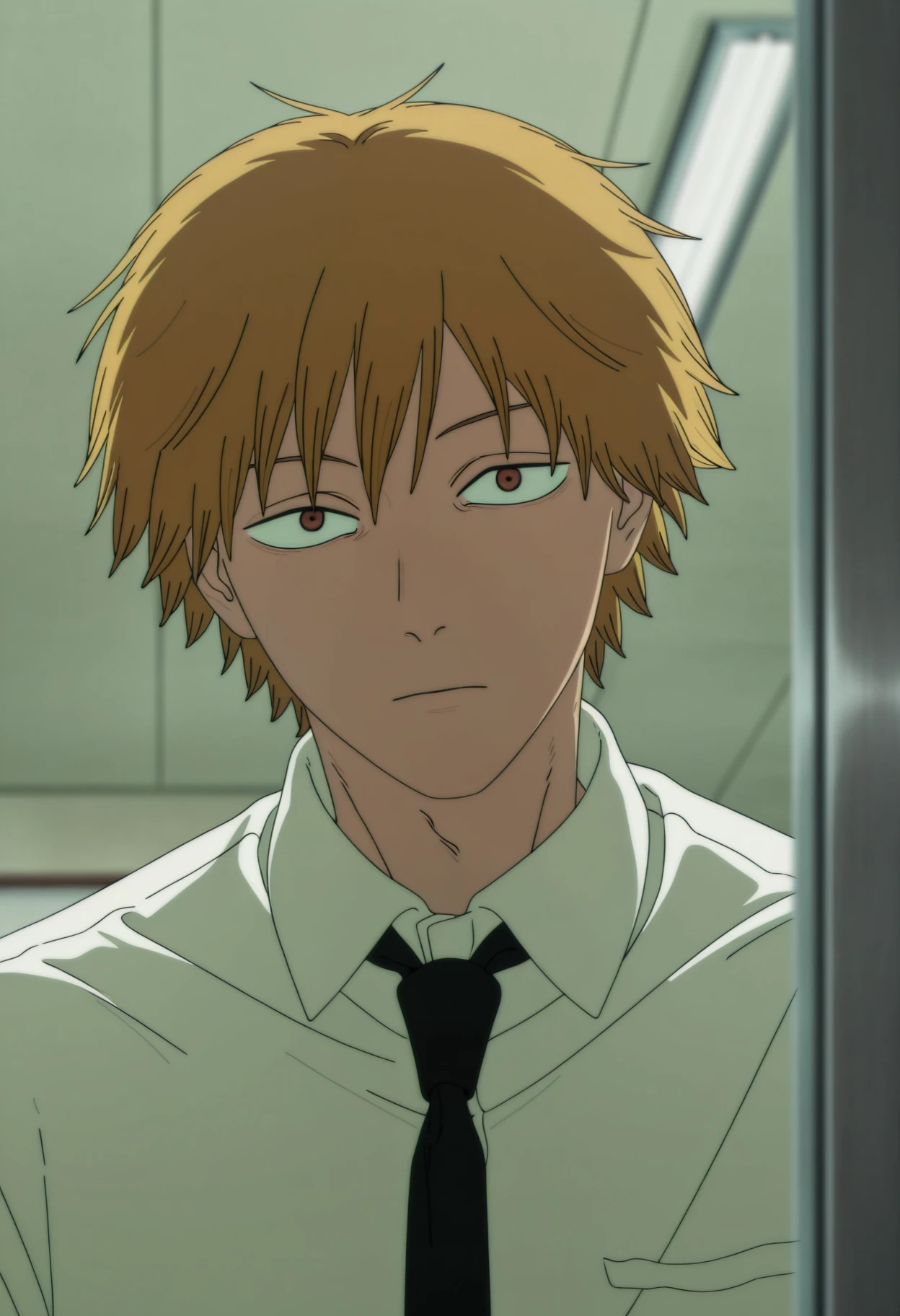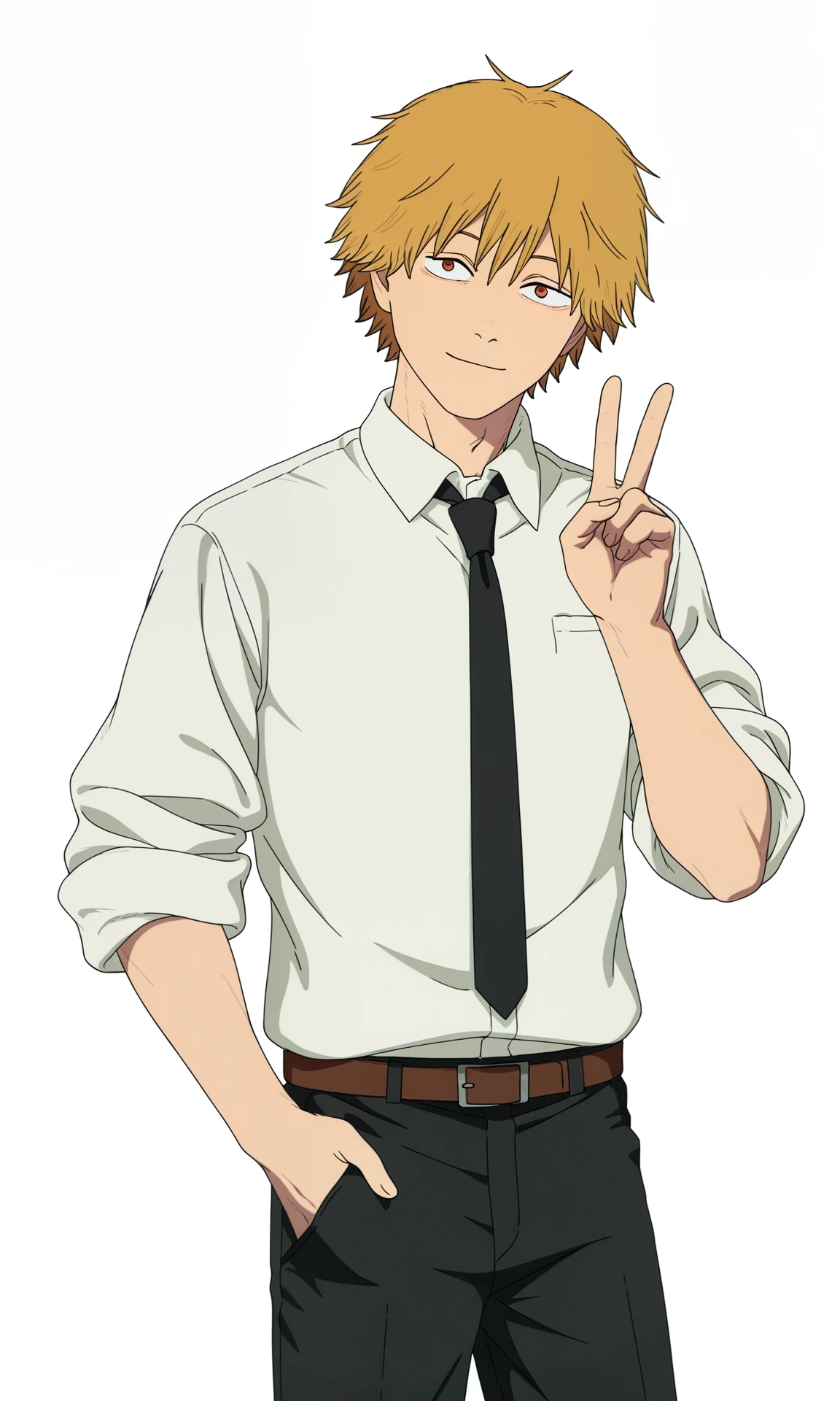 chainsaw man movie style, denji (chainsaw man), 1boy, blonde hair, white shirt, collared shirt, sleeves rolled up, black necktie, belt, black pants