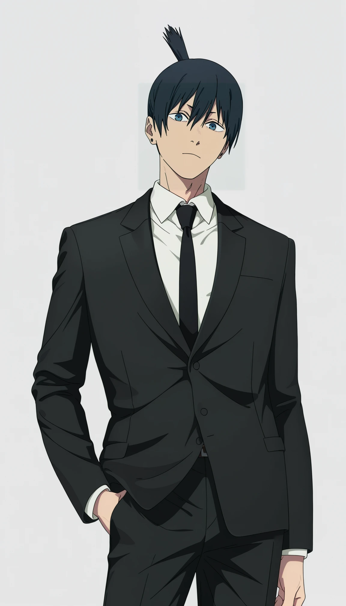 chainsaw man movie style, hayakawa aki, 1boy, black hair, topknot, stud earrings, black jacket, white shirt, formal, black necktie, black pants,