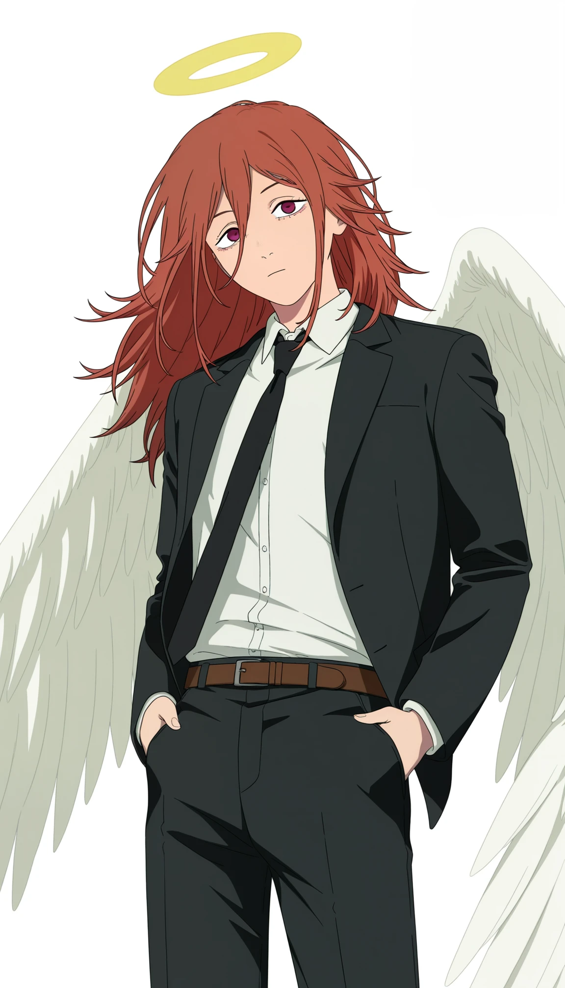 chainsaw man movie style, angel devil (chainsaw man), 1boy, androgynous, red hair, long hair, halo, angel wings, black jacket, white shirt, formal, open jacket, black necktie, belt, black pants,