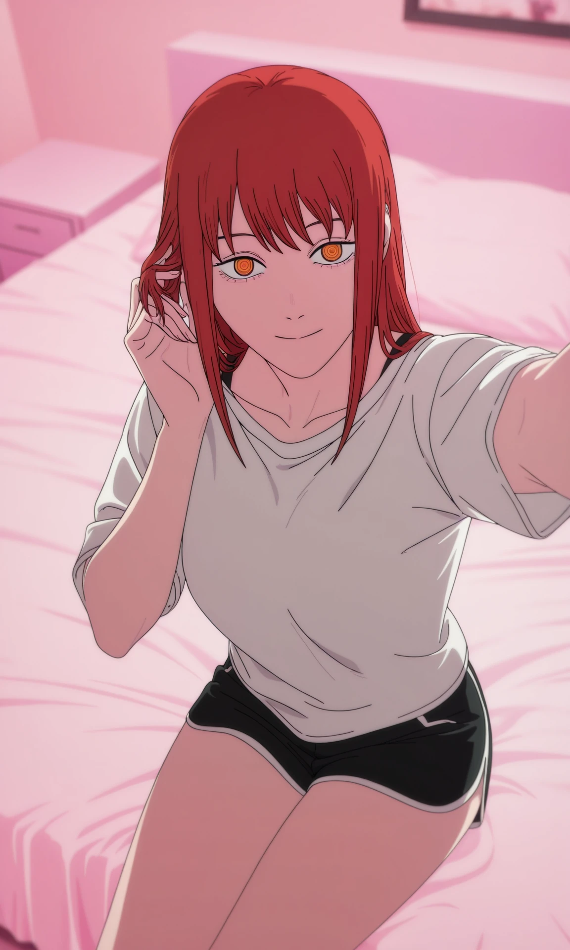 chainsaw man movie style, makima (chainsaw man), 1girl, red hair, long hair, alternate hairstyle, ringed eyes