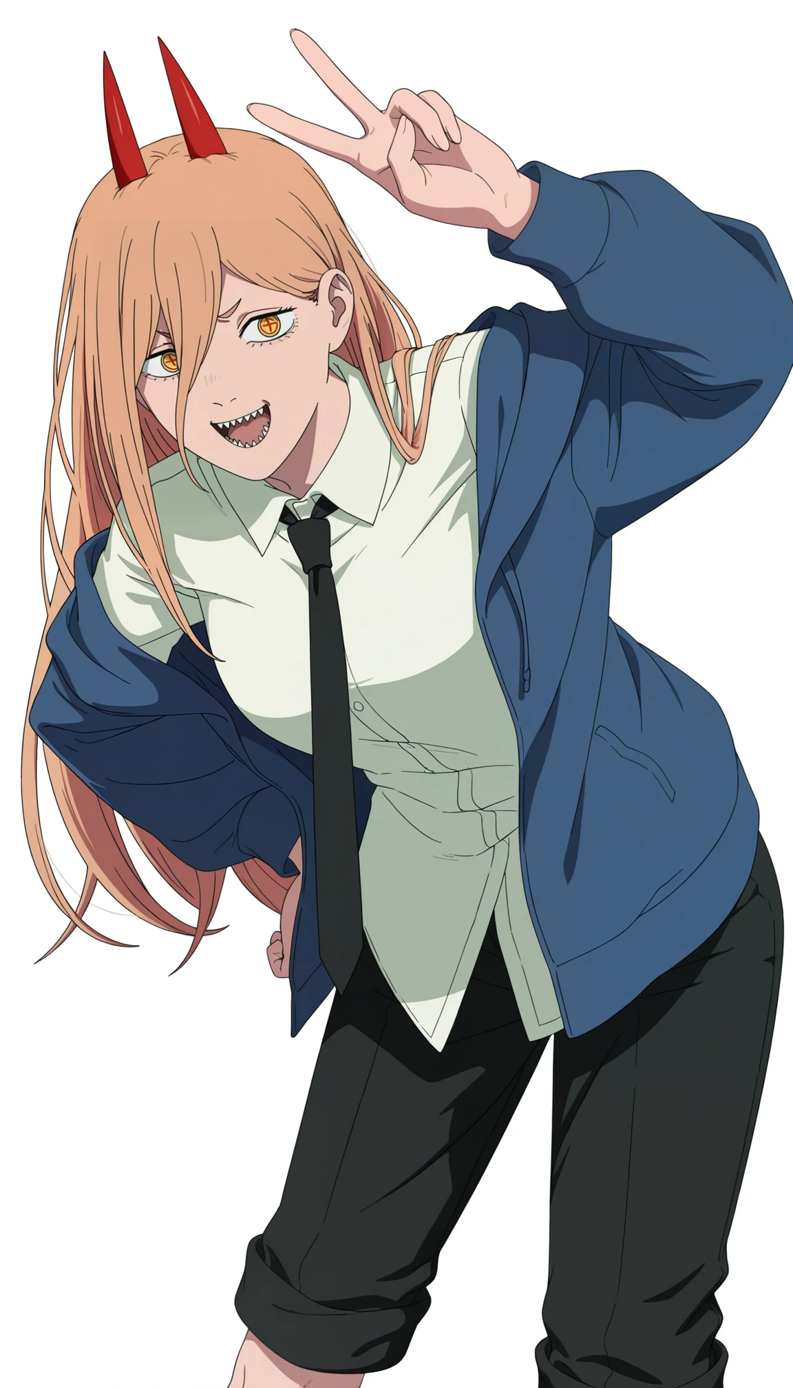 chainsaw man movie style, power (chainsaw man), 1girl, blonde hair, long hair, demon horns, cross-shaped pupils, blue jacket, off-shoulder, white shirt, collared shirt, black necktie, black pants, pants rolled up