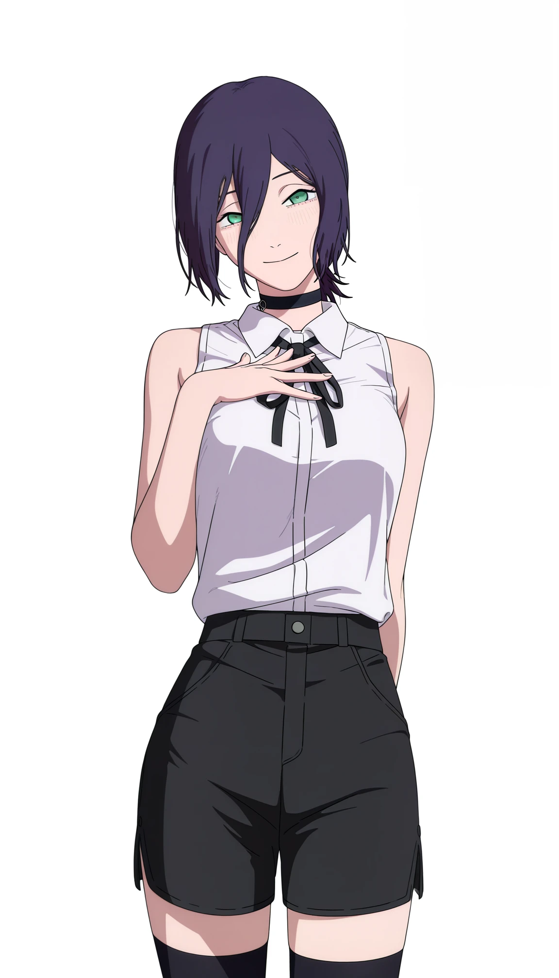 chainsaw man movie style, reze (chainsaw man), 1girl, purple hair, single hair bun, white shirt, collared shirt, sleeveless shirt, black choker, neck ribbon, black shorts, black stockings