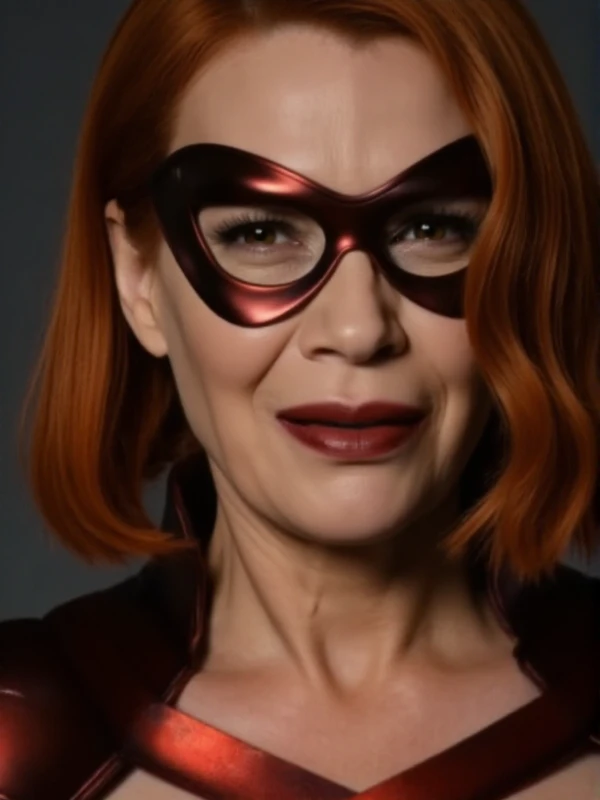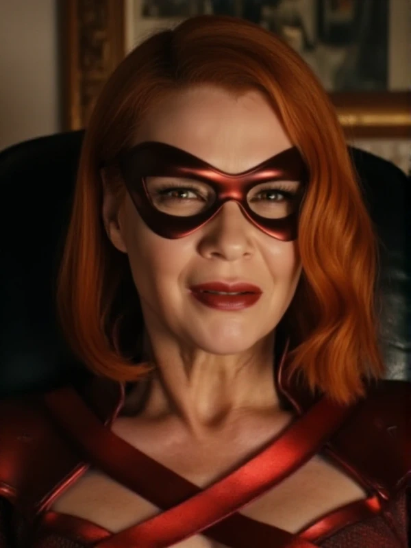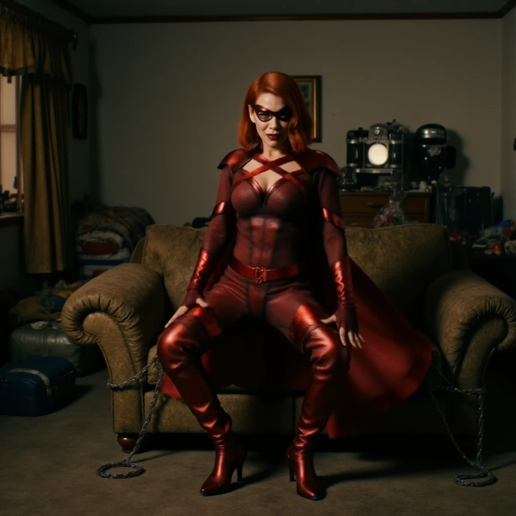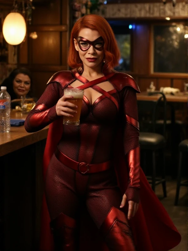 crimson countess, a woman with a superhero mask and bodysuit and a cape