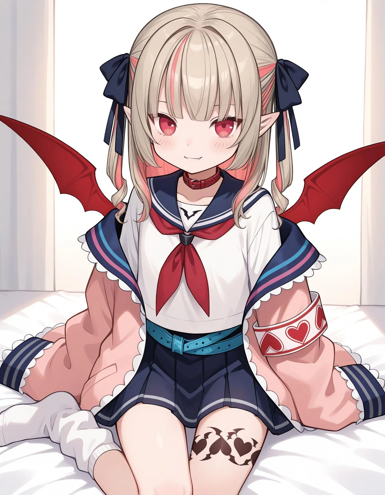 nijiririmu,flat chest,red eyes,long eyelashes,light brown hair,streaked hair,multicolored hair,pink inner hair,pointy ears,fang,leg tattoo,heart tattoo,tattoo around thigh,aged down,red wings,demon wings,long hair,drill twintails,black hair ribbon,