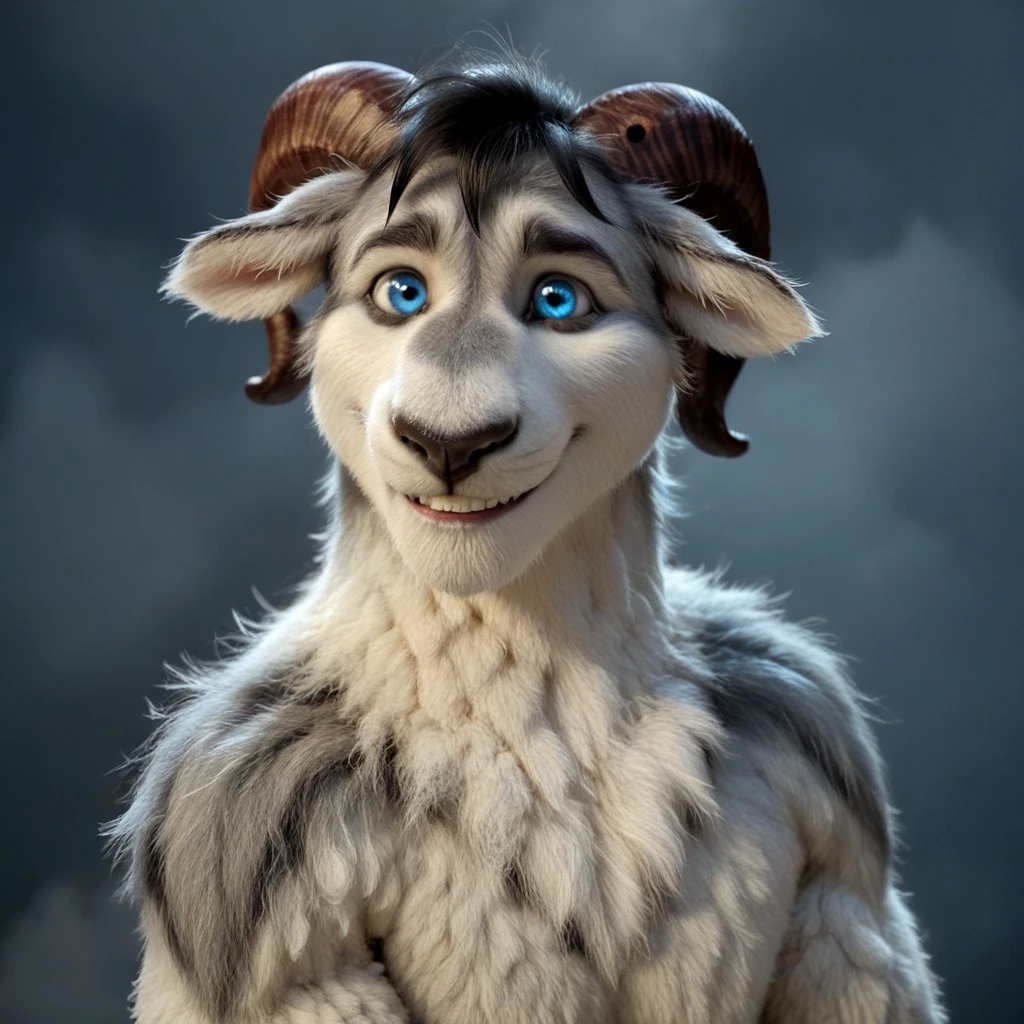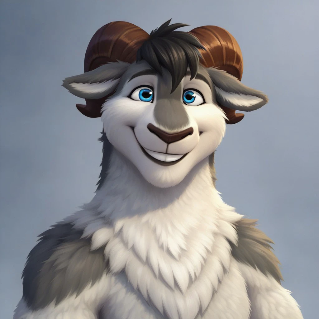 Grey, Grey /Sheep & Wolves/, Sheep, Ram, Long wavy fur, two finger hands, hoof feet, hoof fingers, black lip, black hair, blue eyes, brown horns, floppy ears, furry ears, brown nose, white fur, white wool, grey markings, muscular neck, thick neck