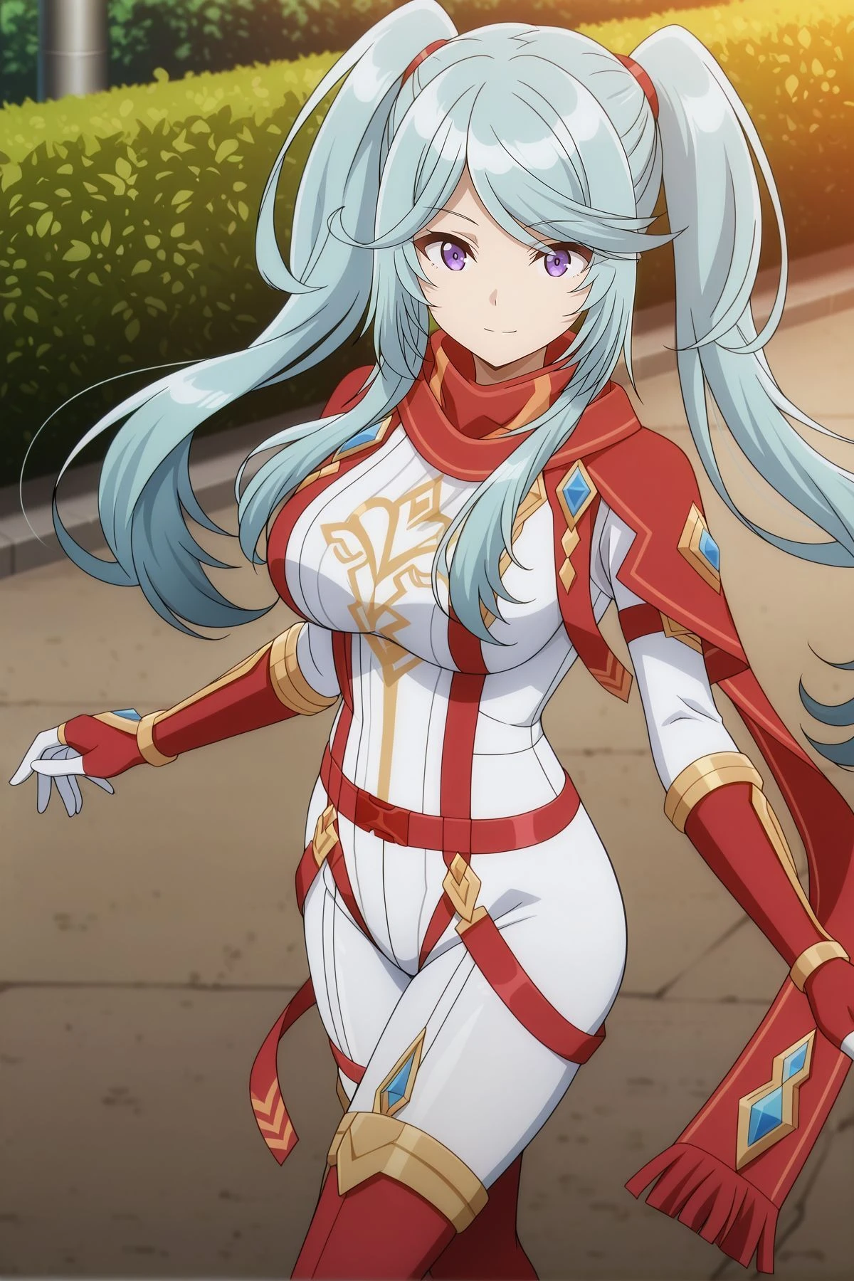 red scarf, white bodysuit, gold trims, blue gem, white gloves, red gloves, red belt, thigh straps, red thighhighs, Alternative :