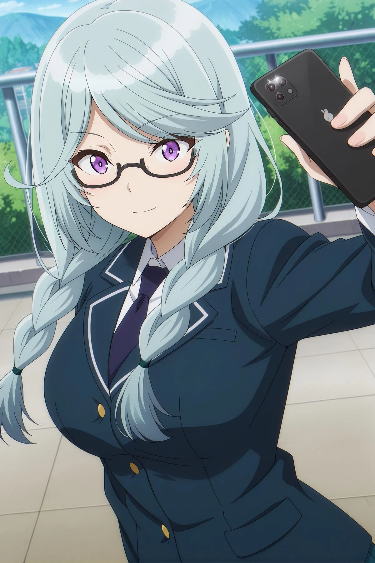 Epsilon, 1girl, solo, purple eyes, blue hair, swept bangs, twin braids, medium breasts,, school uniform, blue uniform, glasses, cellphone,
