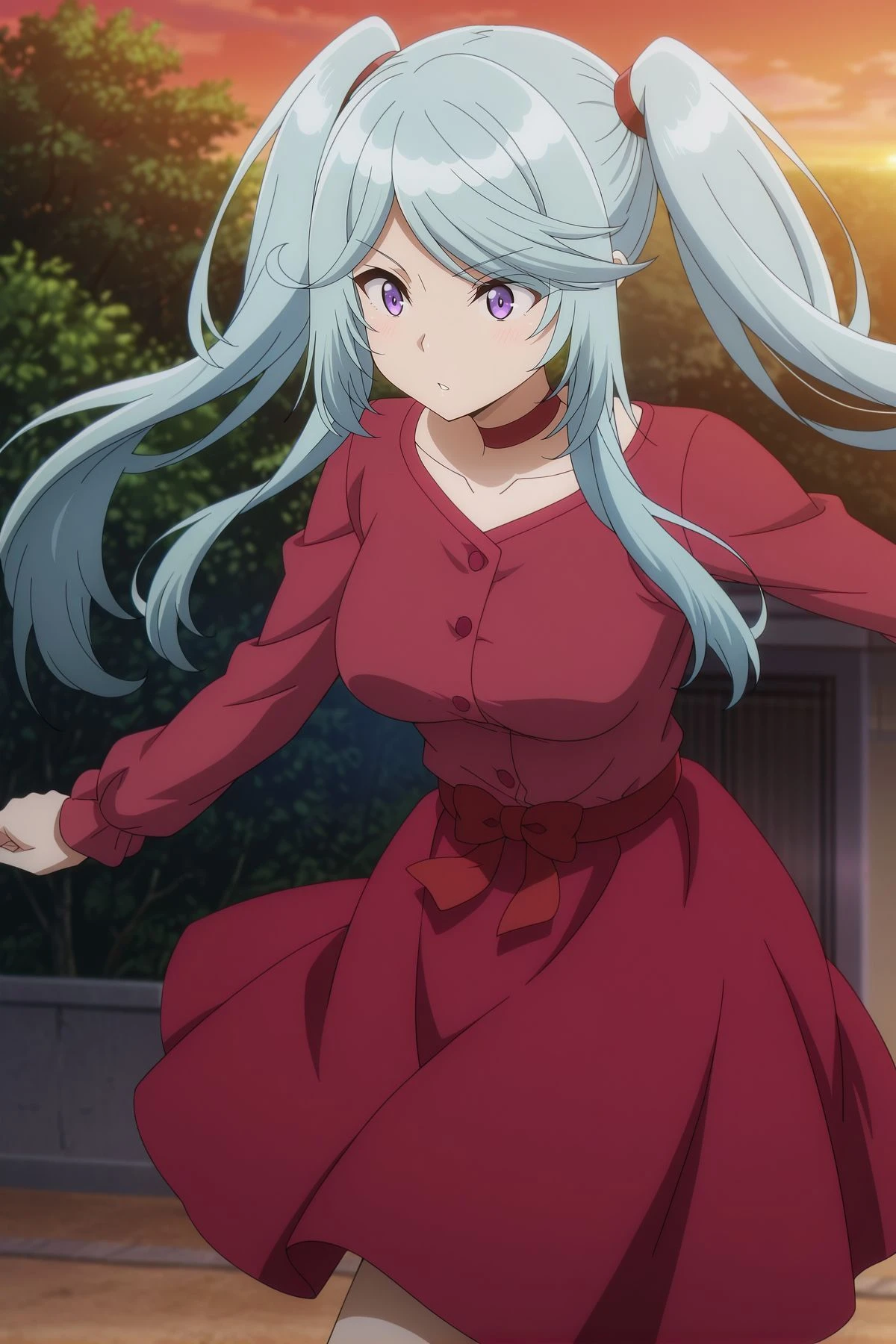 red choker, red dress, long sleeves, red bow, red skirt,