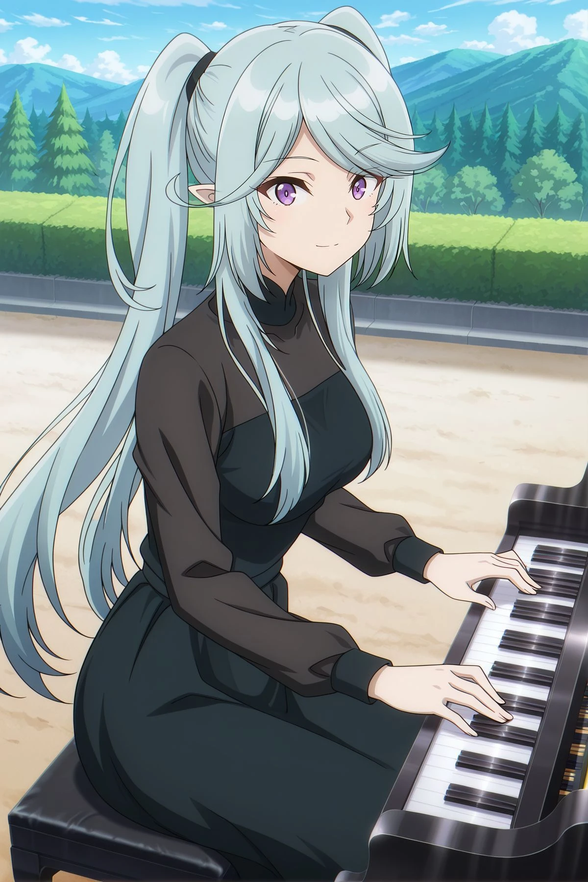 black bodysuit, elbow gloves, black gloves, bare shoulders,Description