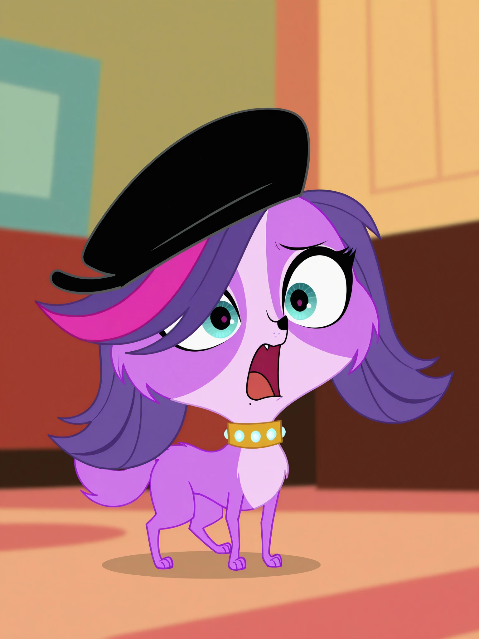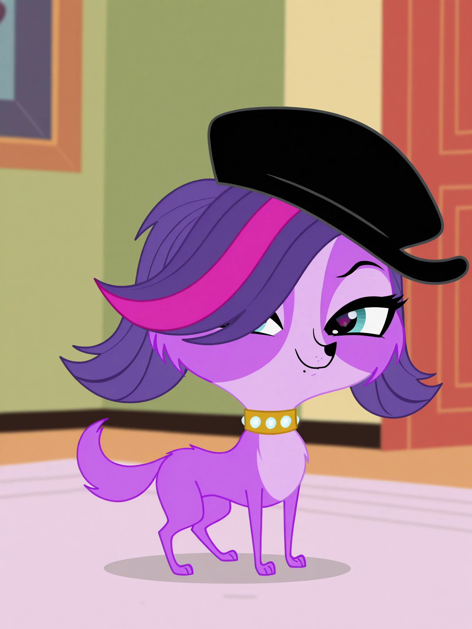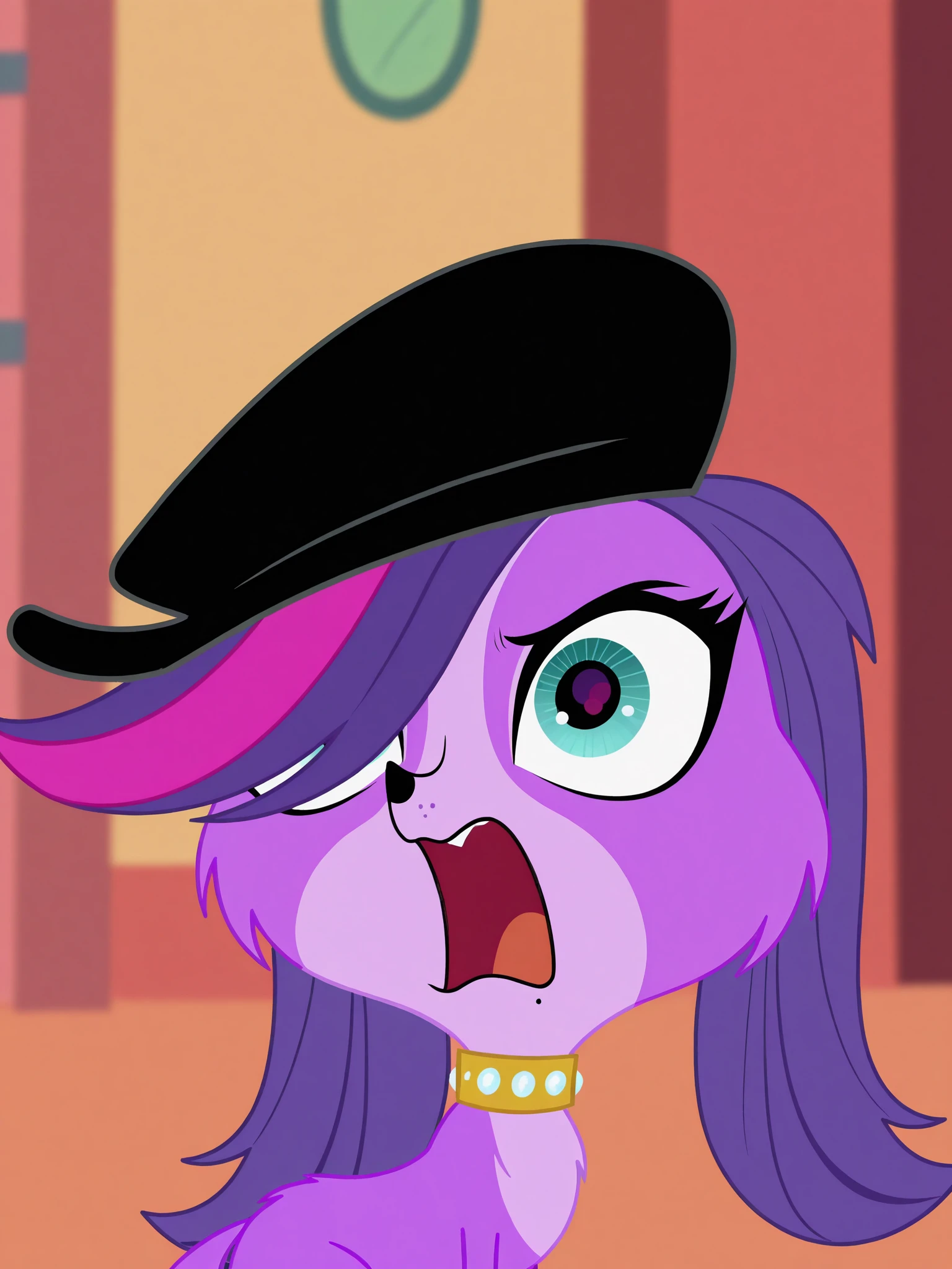 zoetrentllustrious, bangs, hat, pink hair, purple hair, multicolored hair, streaked hair, freckles, dog, feral, purple fur, two tone fur